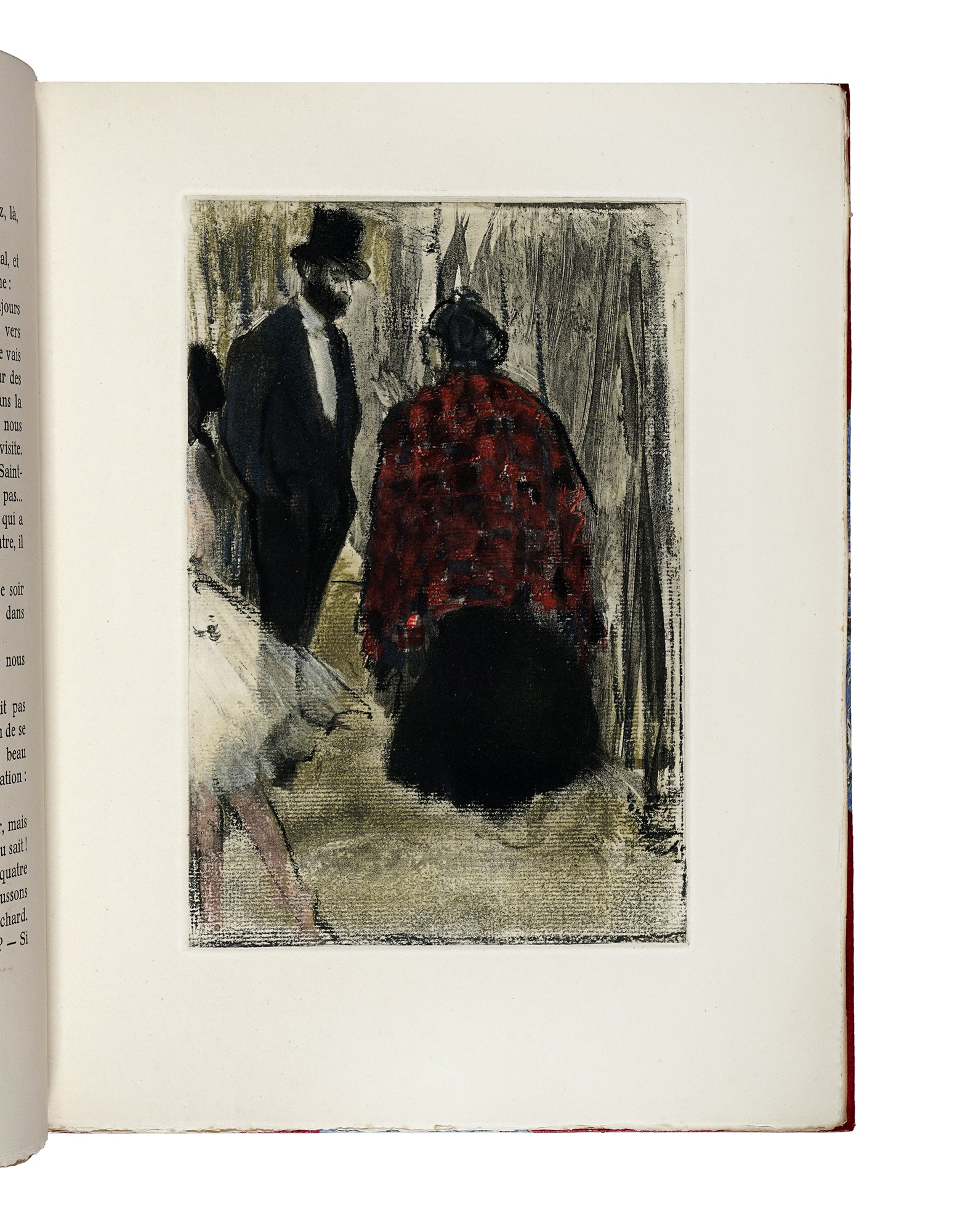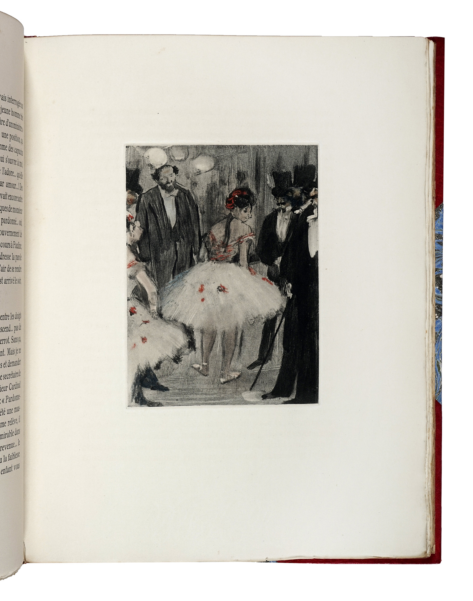In-4° (mm 320x255). Pagine [2], 161, [3]. Con il ritratto dell'Autore in bianco e nero in antiporta fuori testo, 31 incisioni a piena pagina nel testo, di cui 6 a colori, di Maurice Potin su monotipi originali di Edgar Degas e 2 vignette in bianco e nero nel testo. Ottima copia in barbe. Legatura in mezza pelle con punte e piatti marmorizzati; titoli e fregi in oro al dorso a 5 nervi, sguardie marmorizzate e taglio superiore dorato. Difetti alle cerniere del piatto anteriore e qualche lieve abrasione, altrimenti buona conservazione generale. Uno dei 325 esemplari in numeri arabi su velin Rives filigranata, su una tiratura complessiva di 350 copie. Rilegati all'interno i piatti della brossura editoriale. (1) Celebre satira dell'escalation sociale dei corpi di ballo e dell'atmosfera dietro le quinte, che lasciò dubbioso Halévy perché, con la sua vena innovativa, si distaccava probabilmente molto dalla sobrietà del secondo impero. Le incisioni di Potin rimangono un'importante documentazione della loro esistenza dei monotipi di Degas.