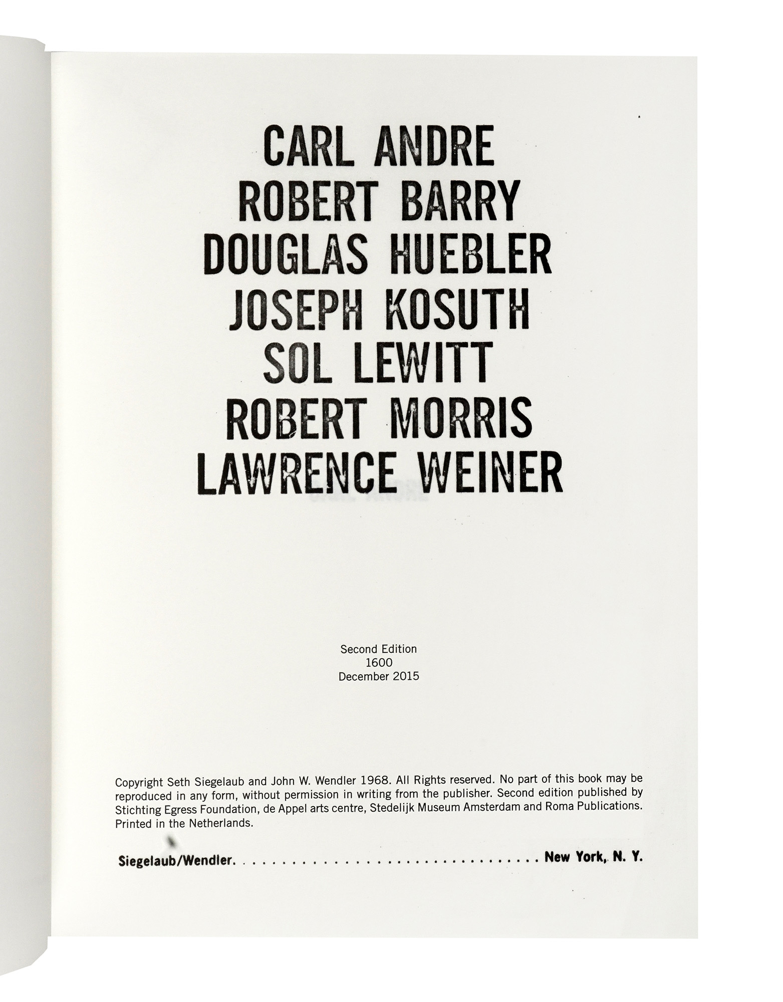 LeWitt Sol [pseud. di LeWitt Solomon], Carl Andre, Robert Barry, Douglas Huebler, Joseph Kosuth, Sol Lewitt, Robert Morris, Lawrence Weiner (Xerox Book). Amsterdam, Roma: Stedelijk Museum, Stichting Egress Foundation, 2015.