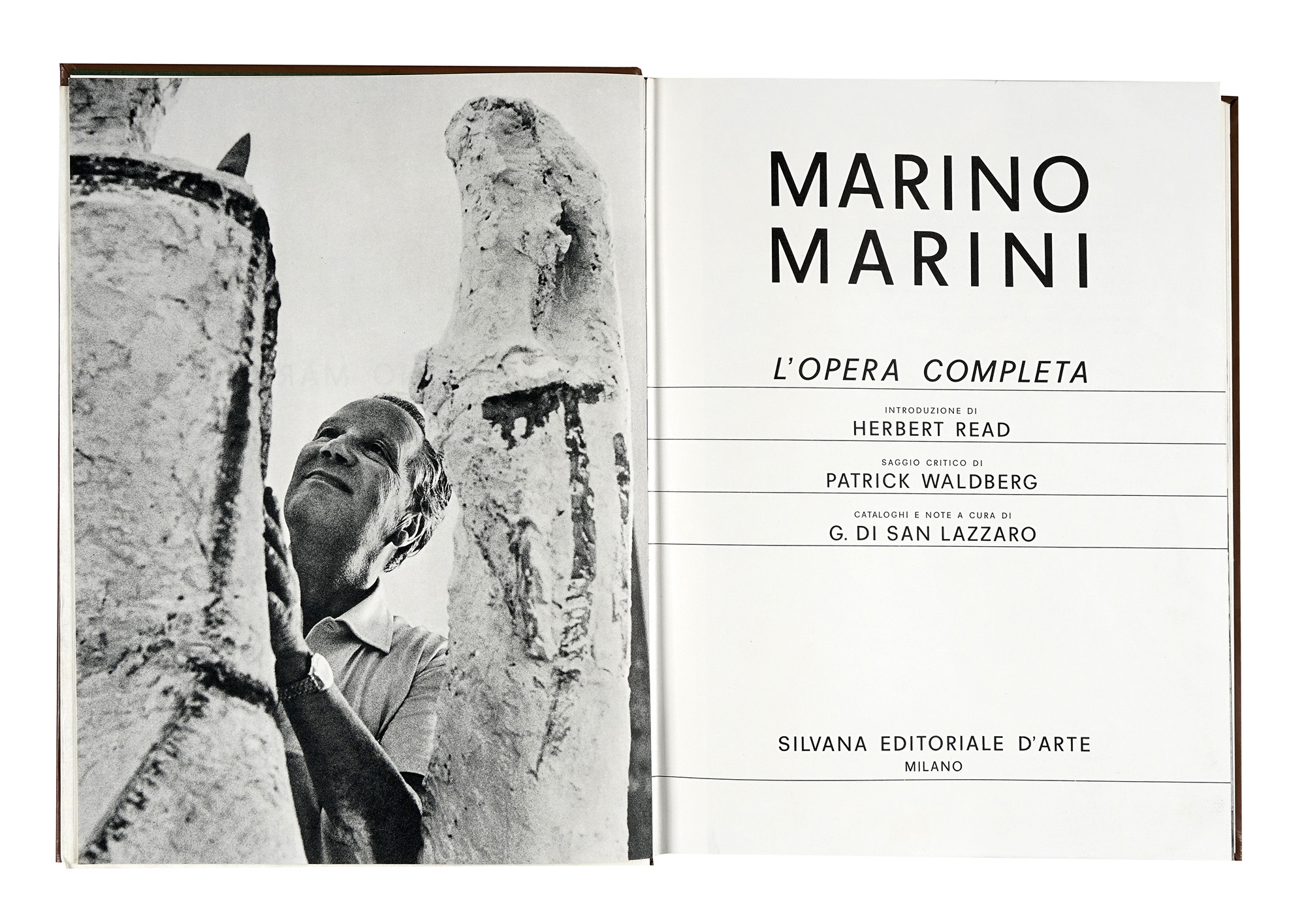 In-4° (mm 345x260). Ottimo esemplare, profusamente illustrato con le riproduzioni a colori e in bianco e nero delle opere di Marino Marini e con una bella litografia a colori (mm 344x255) sciolta, firmata e numerata a mano dall'Artista, che presenta lievi segni di piegatura al margine sinistro. Legatura editoriale in piena pelle, con un'illustrazione in oro al piatto anteriore e titoli al dorso, con sovraccoperta in plastica trasparente con un piccolo strappo alla cuffia superiore. Entro cofanetto editoriale in cartonato, con qualche segno di usura. Una delle prime 50 copie, rilegate in pelle e contenenti la litografia dell'Artista. (1)