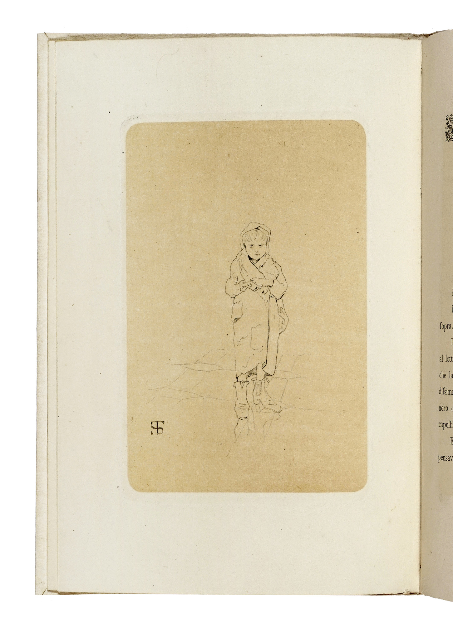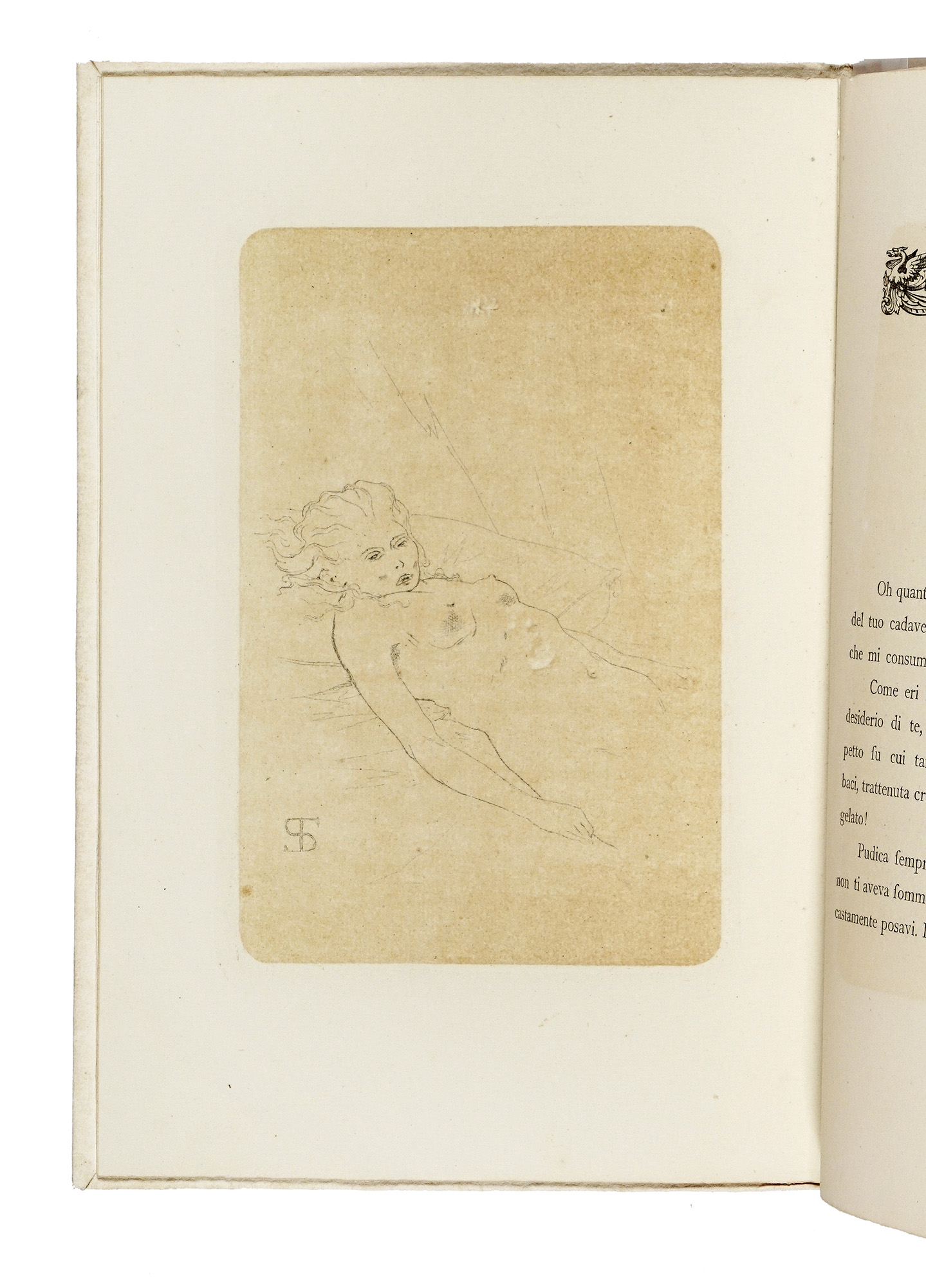 In-8° (mm 238x160). Pagine 21, [3]. Con 3 belle acqueforti di Telemaco Signorini su fondo ocra. Testatine e finalini in legno nel testo. Esemplare ben conservato. Legatura moderna in pieno cartonato muto, con sguardie rinnovate. Edizione di 100 esemplari non numerati. (1) Prima edizione, rarissima, di questa raccolta di prose erotiche, ornate dalle tre splendide acqueforti di Telemaco Signorini (Nudo di donna sdraiata, una Testa di donna e una Bambina), con il quale in quegli anni l'Autore aveva instaurato un fecondo sodalizio. Cfr. Parenti, Rarità bibliografiche II, 174-175.