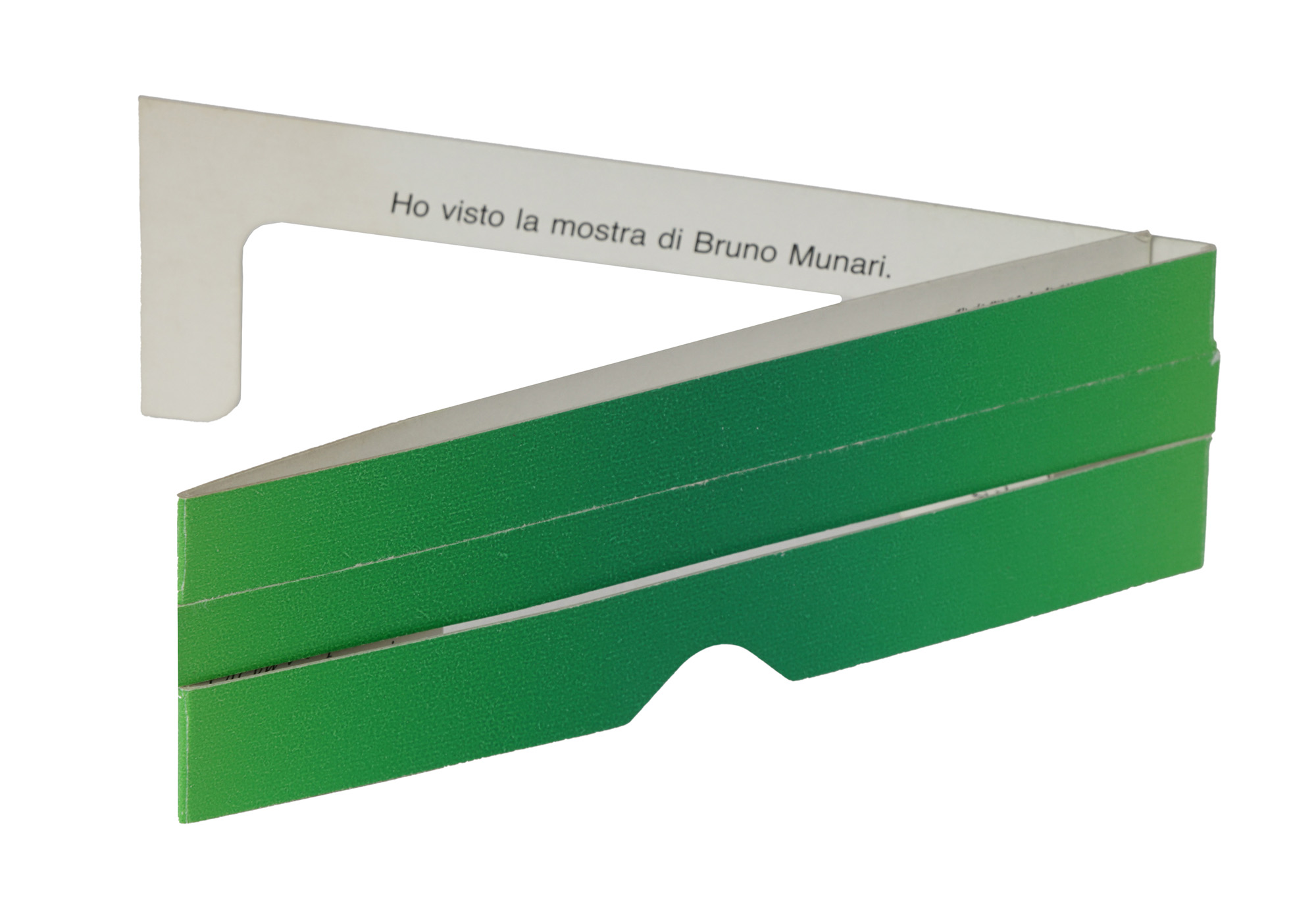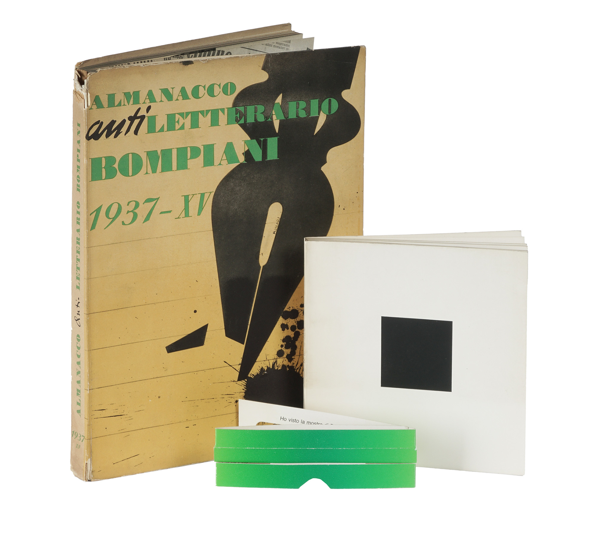 In-4° (mm 280x205). Copia profusamente illustrata in bianco e nero, in ottima conservazione. Legatura editoriale in pieno cartonato illustrato da Bruno Munari, con titoli in rosso e nero al piatto anteriore e al dorso. Mancanze alla cuffia superiore e alle cerniere. SI AGGIUNGE: Id., Il quadrato. Milano: All'insegna del Pesce d'Oro, 1960. In brossura editoriale illustrata, con fascetta editoriale strappata, ma conservata all'interno. SI AGGIUNGE: Occhiali paraluce in cartone ironicamente disegnati da Bruno Munari e realizzati da Arti Grafiche Lucini, in occasione della mostra Ho visto i 90' di Bruno Munari tenutasi alla Triennale di Milano nell'ottobre 1997, per festeggiare il novantesimo compleanno del grande Artista. Una fessura nella parte anteriore, quasi a proteggere gli occhi dalla radiosità dell'evento; sui lati interni, invece, la scritta 'Ho visto la mostra di Bruno Munari', anche in inglese, francese e giapponese. (3) I OPERA: L'Almanacco riusciva a unire il meglio delle tradizioni passate con l'innovazione del presente, facendolo attraverso immagini che restano impresse nella memoria. Il suo punto più alto forse si raggiunge nell'Almanacco anti-letterario del 1937, dove Munari crea una sorta di cortometraggio composto da fotomontaggi. Le pagine presentano un cerchio fustellato in alto a destra che lascia sempre visibile il volto di Mussolini mentre incita la folla. Il titolo, «Udite! Udite!», riflette perfettamente l'ironia sottesa all'opera, una critica velata alla retorica del regime: un almanacco che si definisce anti-letterario e che si schiera contro la retorica del tempo. II OPERA: Edizione originale, in 3000 esemplari, del primo libro di Munari dedicato alle forme basilari. In quest'opera l'Artista si dedica allo studio del quadrato e al suo uso nel corso della storia umana, dall'arte sacra antica al disegno industriale.
