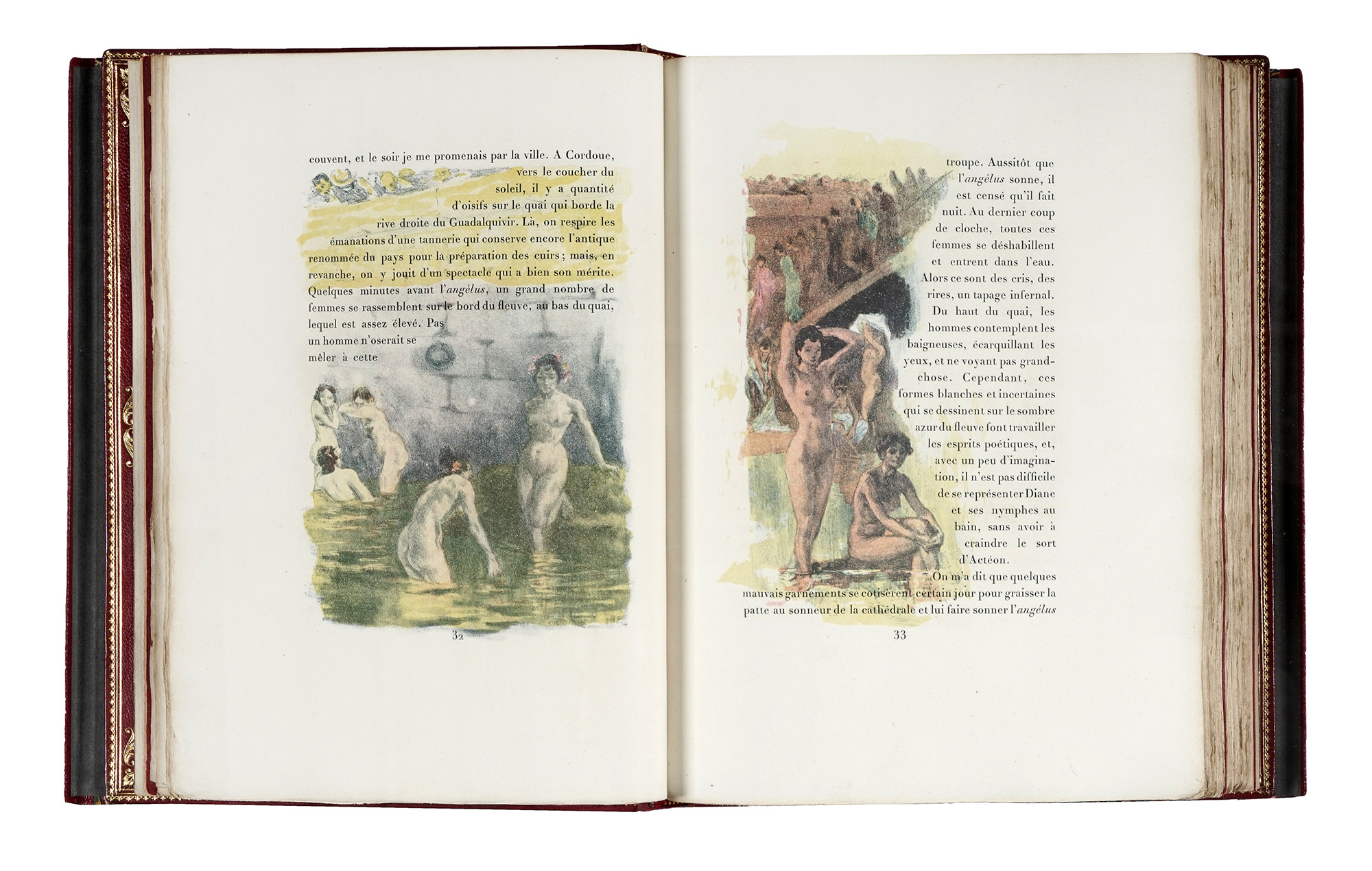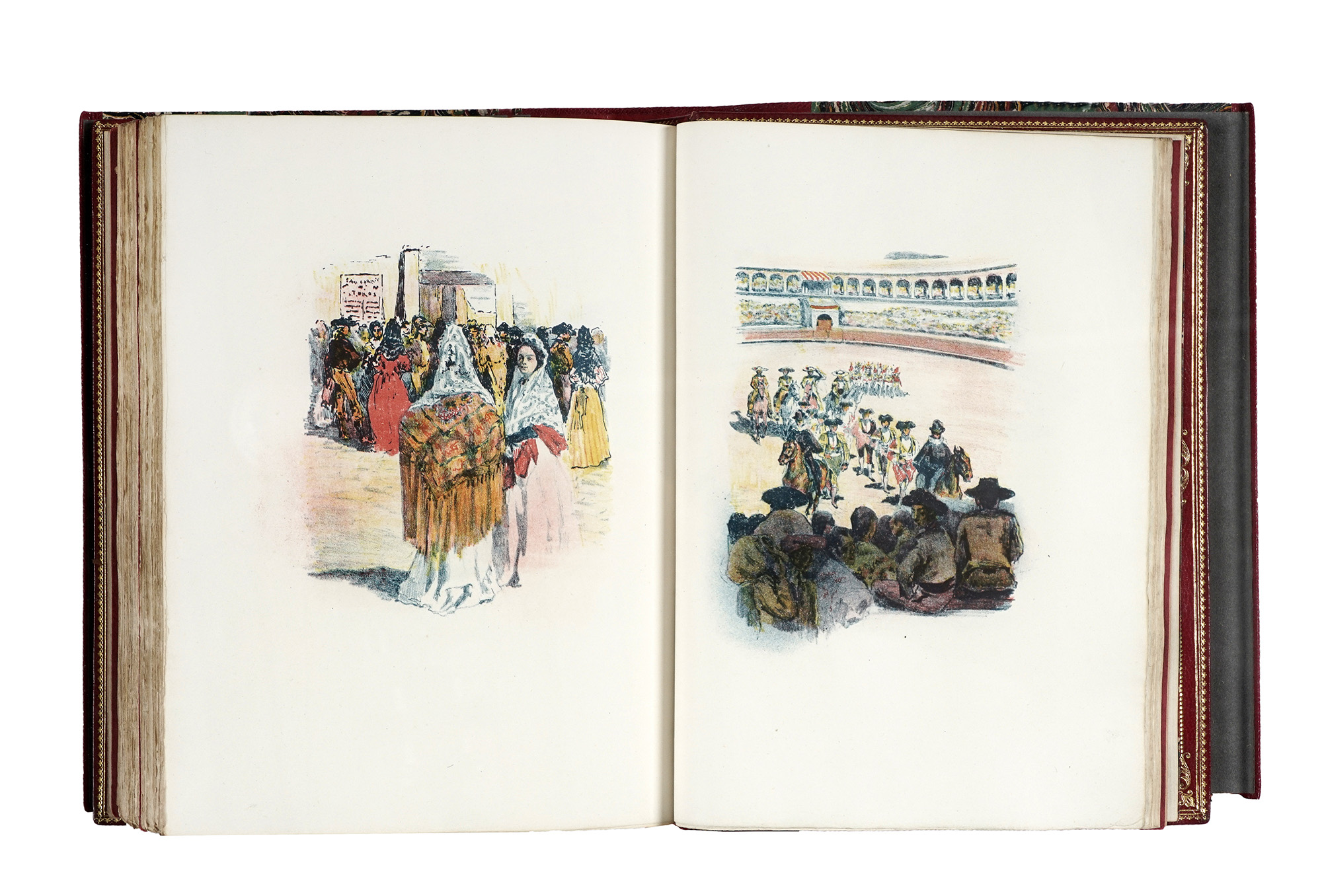 2 tomi in 1 volume in-8° (mm 220x165). Un volume di testo: pagine [2], VII, [1], 168, [2], con le splendide litografie a colori di Alexandre Lunois nel testo e volume di tavole: pagine [6] di testo + [85] carte di tavole, stampate recto-verso, con la suite delle litografie a colori dell'Artista. Ciascuna parte, in ottimo stato di conservazione, con proprio frontespizio. Legatura d'amatore in pieno marocchino, firmata Pierson, con ampie decorazioni fitomorfe entro cornici di filetti concentrici al piatto e titoli e fregi in oro al dorso; taglio superiore dorato e sguardie marmorizzate. Sovraccoperta in mezza pelle, con titoli in oro al dorso e piatti marmorizzati e cofanetto coordinato, con tracce d'uso ai tagli e alle cerniere. Conservati all'interno i piatti delle brossure originali rosse, con titoli in giallo e nero. Splendido esemplare di una tiratura di 125 copie ad personam. Ex-libris cartaceo. (1) Alexandre Lunois, che conosceva molto bene la Spagna, ha utilizzato le litografie di questo libro per raffigurare ballerine, gitani, toreri e paesaggi spagnoli.