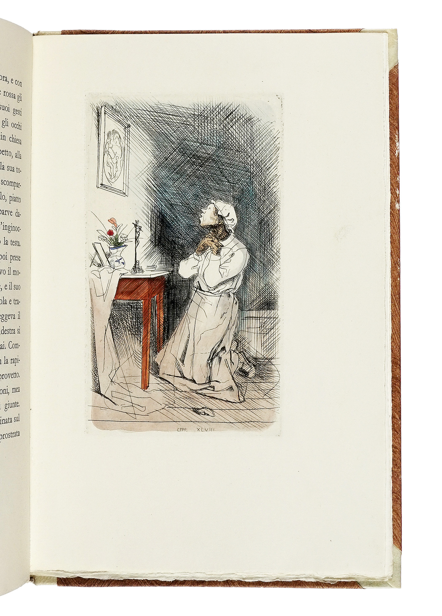 In-8° piccolo (mm 180x115). Pagine [2] bianche, 31, [5] (l'ultima carta bianca). Con 1 ritratto dell'Autore inciso all'acquaforte in antiporta e 2 acqueforti acquerellate a mano di Pietro Annigoni. Uno dei 120 esemplari ad personam in mezza pergamena editoriale con titoli dorati al dorso entro custodia di cartone, con minimi difetti. (1) Mardersteig 91; Parole figurate 64.