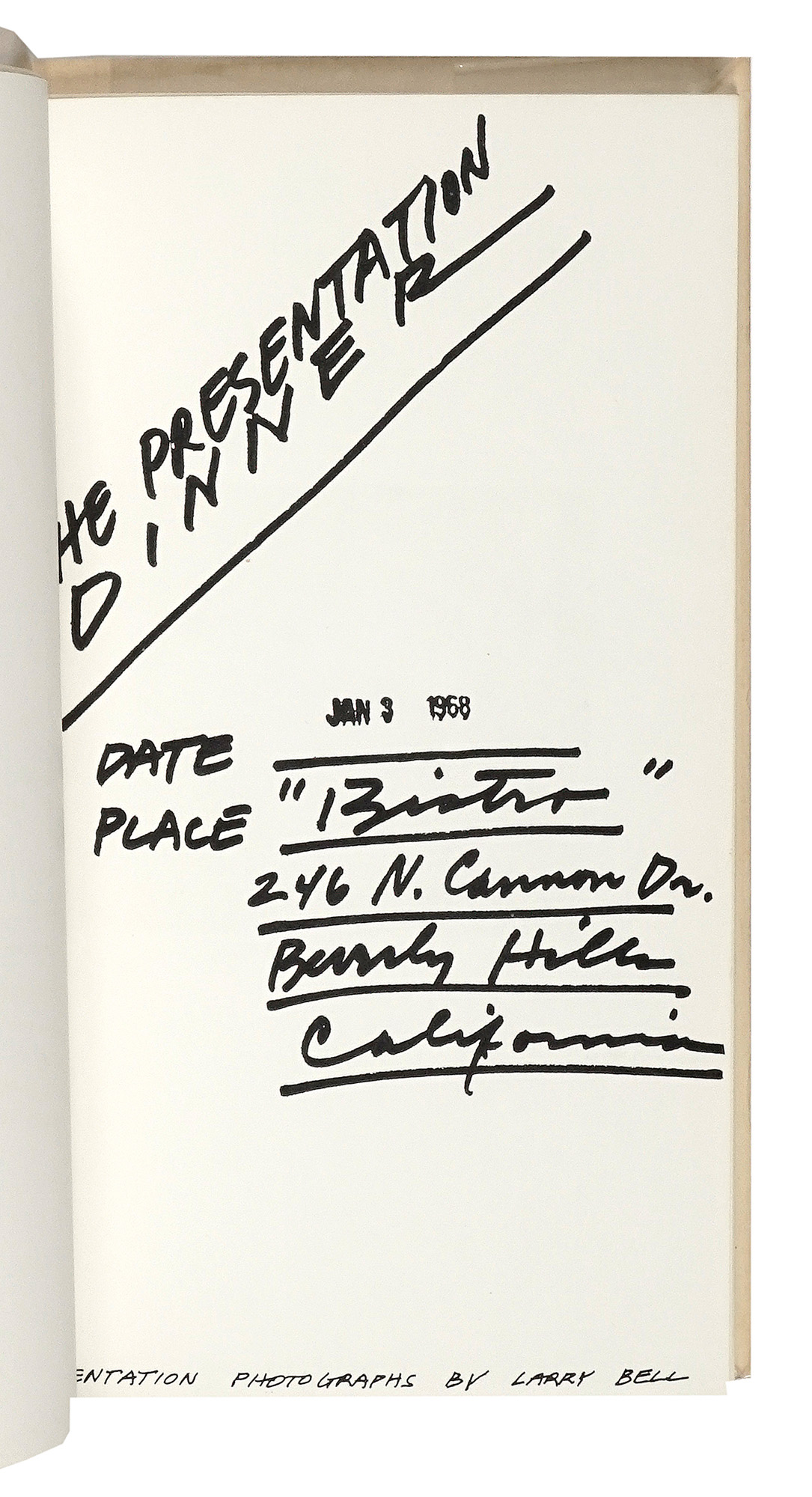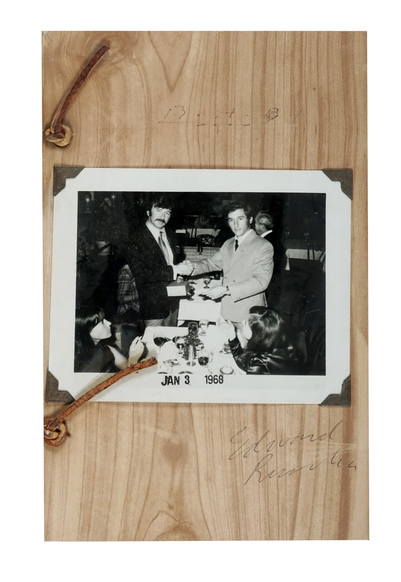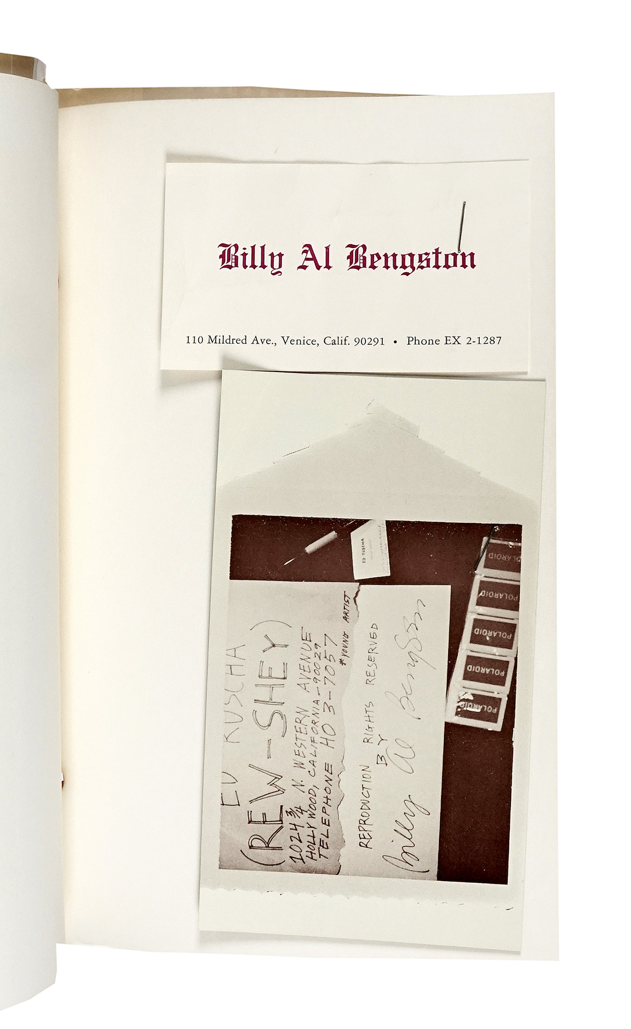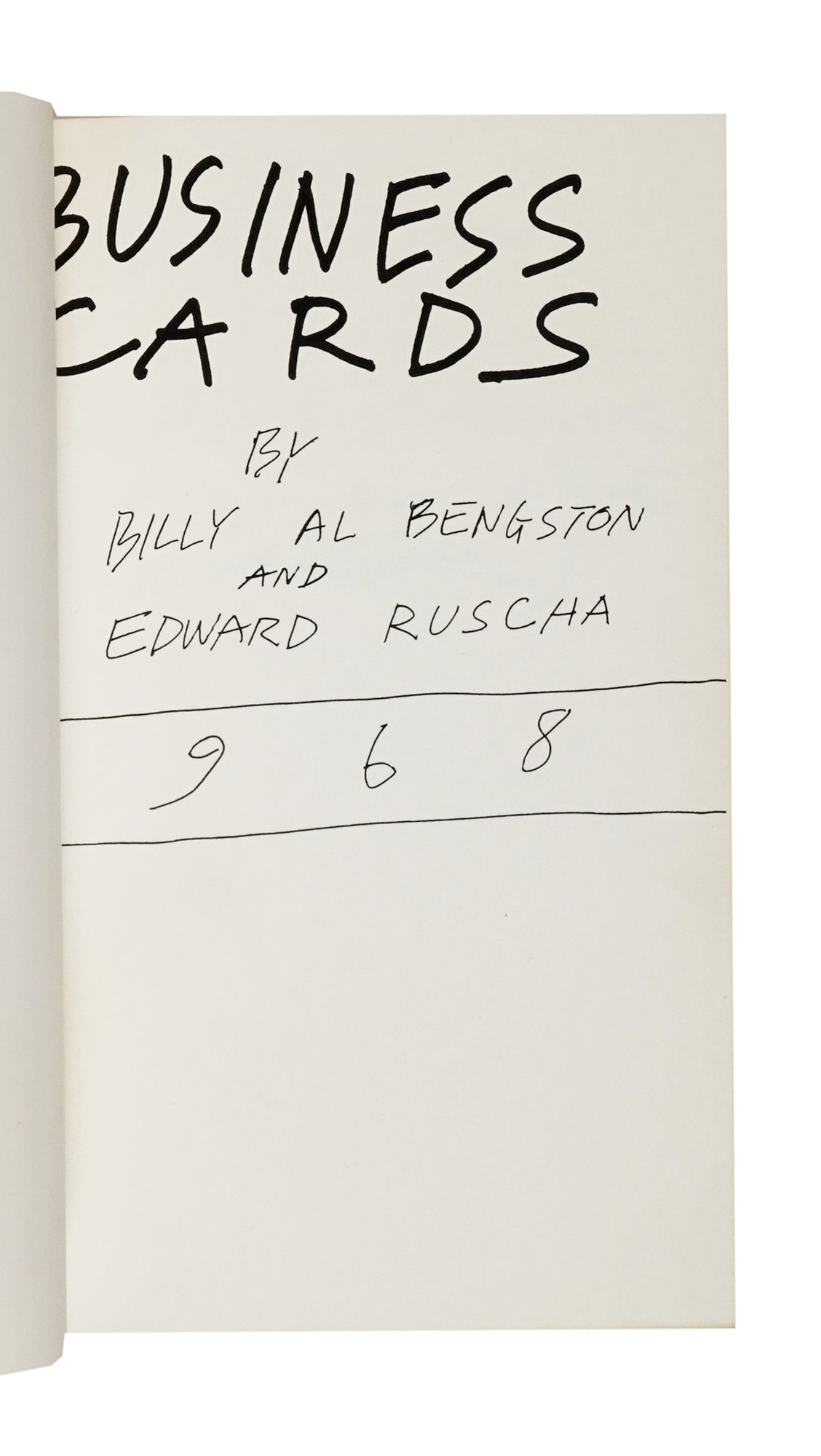 In-8° (mm 224x143). Carte [14] con le riproduzioni di fotografie di Larry Bell e Ken Price e i biglietti da visita di Ed Ruscha e Al Bengston spillati al recto dell'ultima carta. Brossura originale effetto legno, con cordoncino in pelle e una fotografia originale degli Artisti montata con angoli fotografici al piatto anteriore. Firma autografa di Ed Ruscha e Al Bengston al piatto anteriore. Ottima copia, con lievi bruniture da esposizione alla fotografia e minimi segni di usura ai legacci in pelle, che risultano integri. (1) Rara prima edizione, di questo libro d'artista stampato per commemorare la genesi, il processo, la stampa e la distribuzione dei biglietti da visita dei due Artisti. L'azione artistica di Ruscha e Al Bengston, svoltasi dal 27 dicembre 1967 al 3 gennaio 1968, è stata documentata dai fotografi Larry Bell e Ken Price e consiste in un geniale e divertente progetto di scambio di biglietti da visita, che inizia con la progettazione dei biglietti da parte degli artisti e termina con uno scambio cerimoniale al ristorante Bistro di Beverly Hills. I biglietti da visita degli artisti sono spillati alle pagine finali del libro e la copia e è firmata dai due Artisti al piatto anteriore.