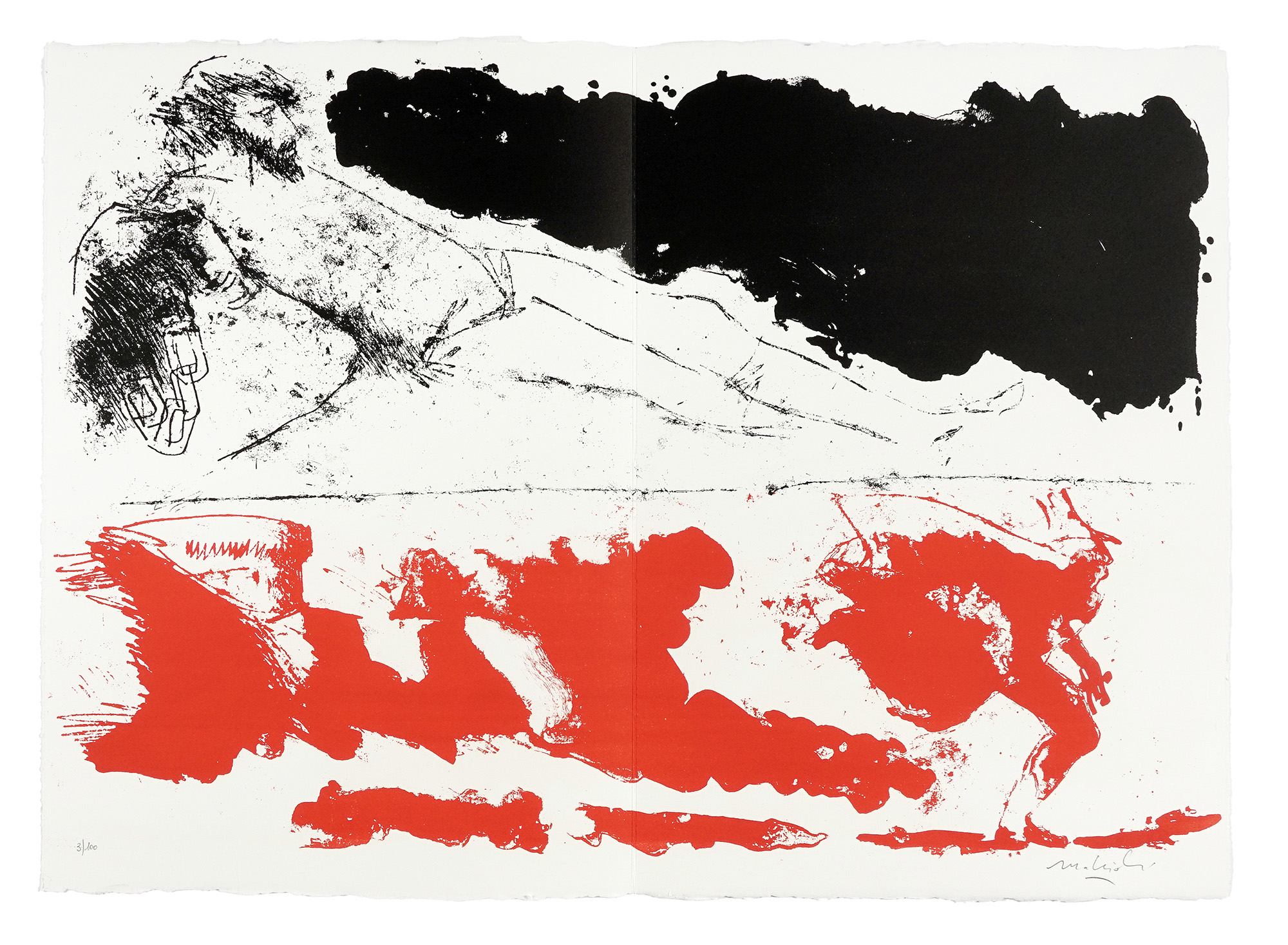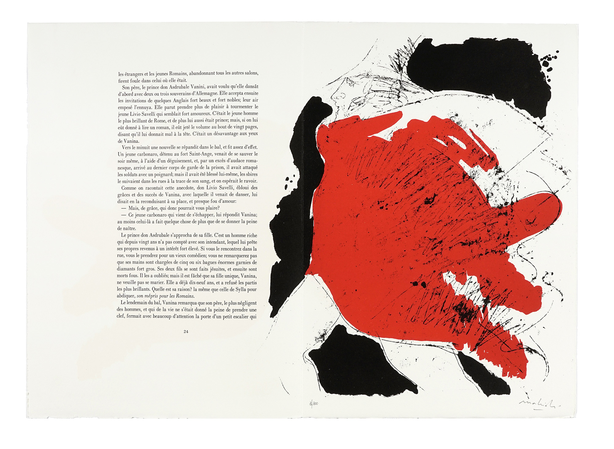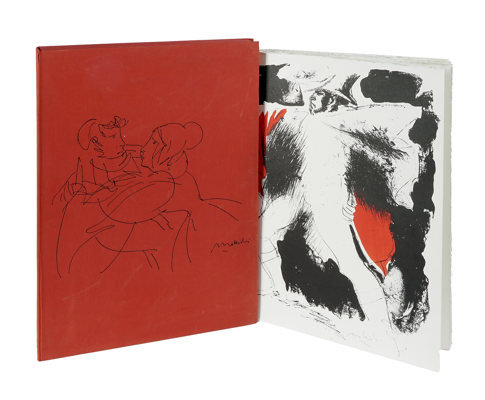 In-folio (mm 440x315). Esemplare a fogli sciolti, perfettamente conservato nelle sue barbe, con 10 litografie originali a colori di Carlo Mattioli, di cui 9 nel testo numerate e firmate a matita dall'Artista. Entro cofanetto editoriale in piena tela rossa, con titoli in nero al dorso e un'illustrazione di Mattioli al piatto anteriore. Lievi segni di usura, ma nel complesso buona conservazione. (1) Esemplare in barbe di quest'opera con prefazione di Giancarlo Vigorelli e litografie tirate sui torchi a mano di Giorgio Upiglio.