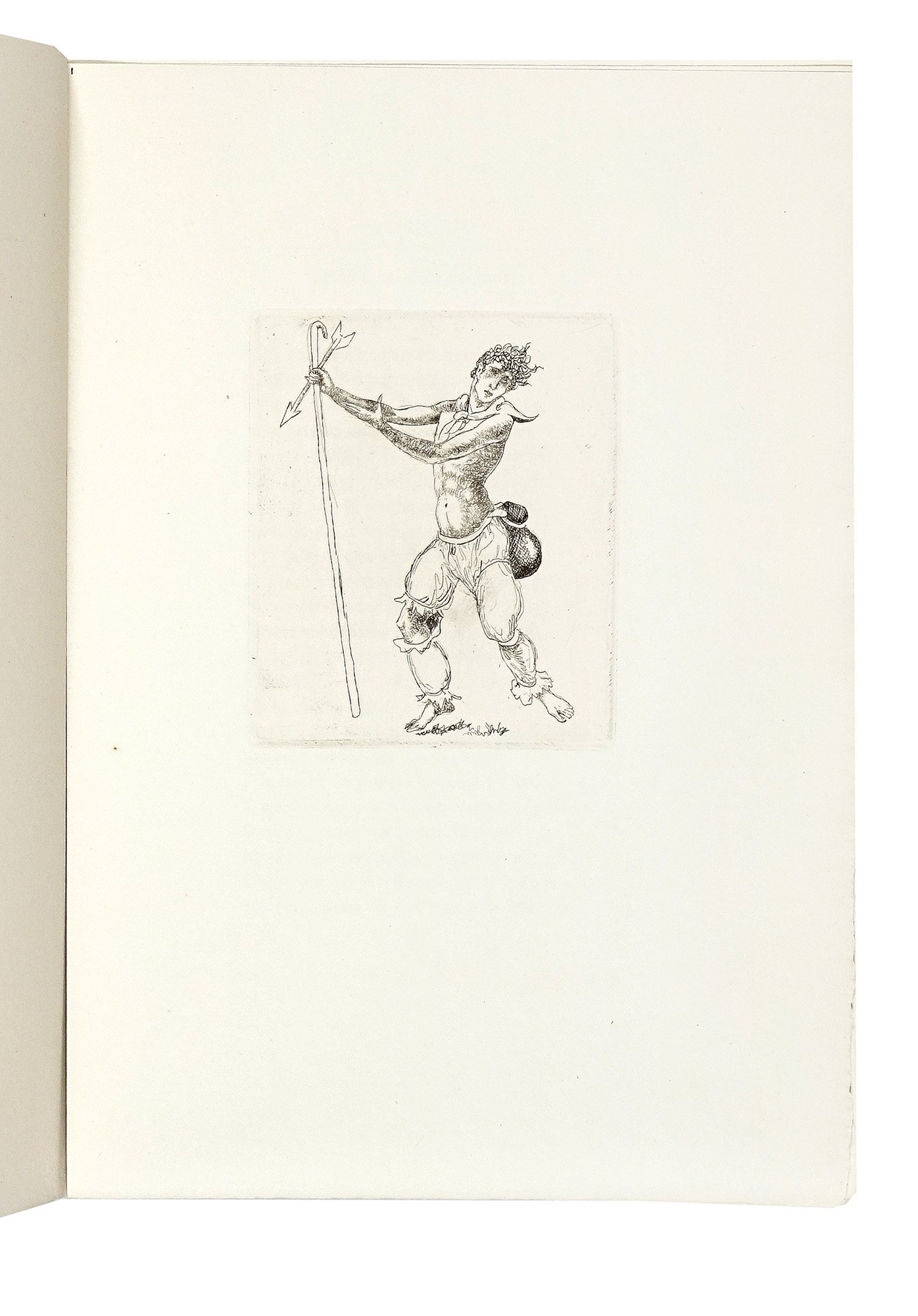 In-4° piccolo (mm 290x200). Con 7 acqueforti di Francesco Chiappelli, di cui 2 a piena pagina. Rare e lievi fioriture, altrimenti esemplare intonso, non ancora rilegato e ottimamente conservato nelle sue barbe. Esemplare non numerato, di una tiratura complessiva di 120 copie. (1) Mardersteig 45: «L'Aminta del Tasso è la prima pubblicazione dell'Associazione dei Cento Amici del Libro fondata quell'anno e dovuta all'iniziativa di Ugo Ojetti, Tammaro De Marinis e della marchesa Gilberta Serlupi Crescenzi. Il carattere Griffo, qui usato per la prima volta per un'edizione, è arricchito nel corsivo di maiuscole ornate per la composizione dei nomi dei personaggi.». Parole figurate 50-51. Il presente esemplare proviene dalla collezione di Leo Plinio Antoniazzi, stampatore dell'Officina Bodoni che Giovanni Mardersteig portò a Verona a seguito dell'incontro con D'Annunzio.