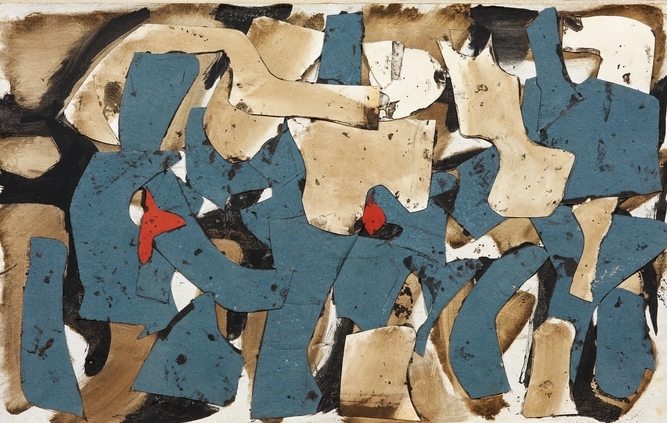 Conrad Marca-Relli (Boston 1913 - Parma 2000) J - S - 1 - 71 collage polimaterico e olio su cartone su tela, cm 36,5x58 firmato sul retro: sul telaio, timbro Archivio Marca-Relli con n. 09438 Bibliografia M. Vallora, Marca-Relli l’amico americano. Sintonie e dissonanze con Afro e Burri, Parma 2002, p. 210 Provenienza Collezione privata Galleria Niccoli, Parma