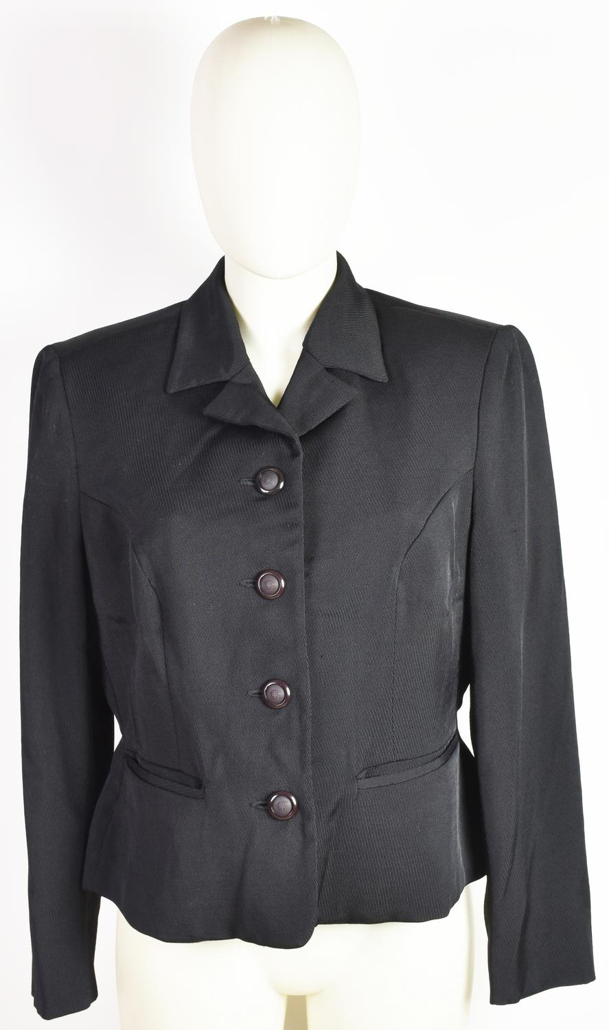 Giacca nera con chiusura a quattro bottoni. Presenta spalline imbottite e due tasche a filetto. Manca etichetta di composizione. Taglia 46 IT. Prodotto in Italia. Ben conservato.