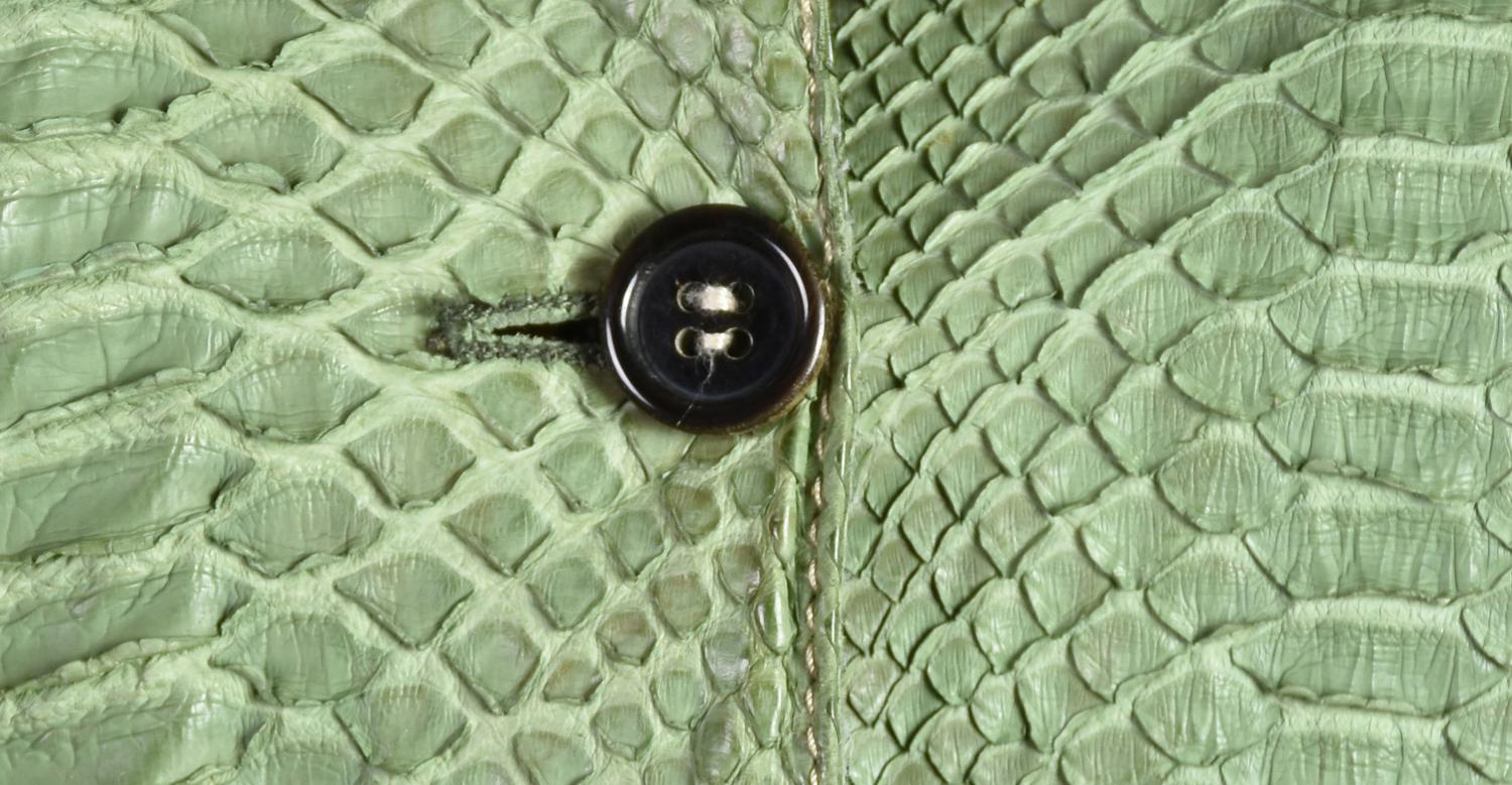 Giacca corta in pitone verde a due bottoni con due tasche frontali. Taglia L ma veste una M. Prodotto in Italia. Segni d’uso e del tempo. Ben conservata.
