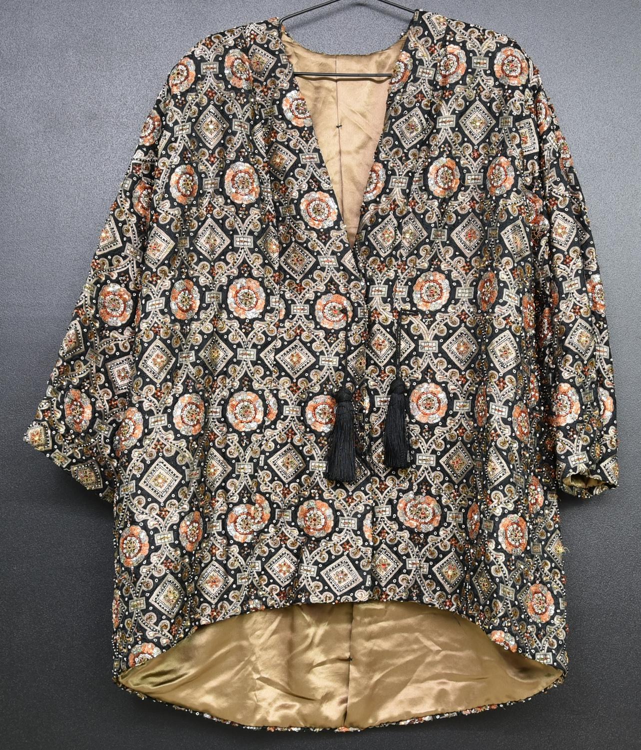 Giacca in stile orientale con decoro di paillettes. Manca etichetta di taglia e composizione. Made in Italy. Lavorazione sartoriale. Vista la natura dell’articolo non si escludono piccole mancanze. Ben conservato.