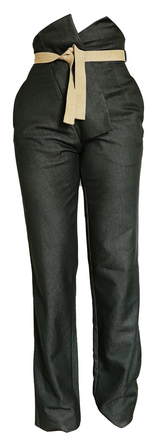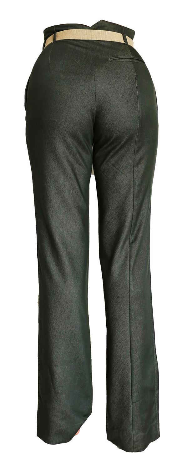 high-waisted trousers in forest green wool gabardine with elastic cord belt and pockets. Made in England. UK size 10. Well preserved.