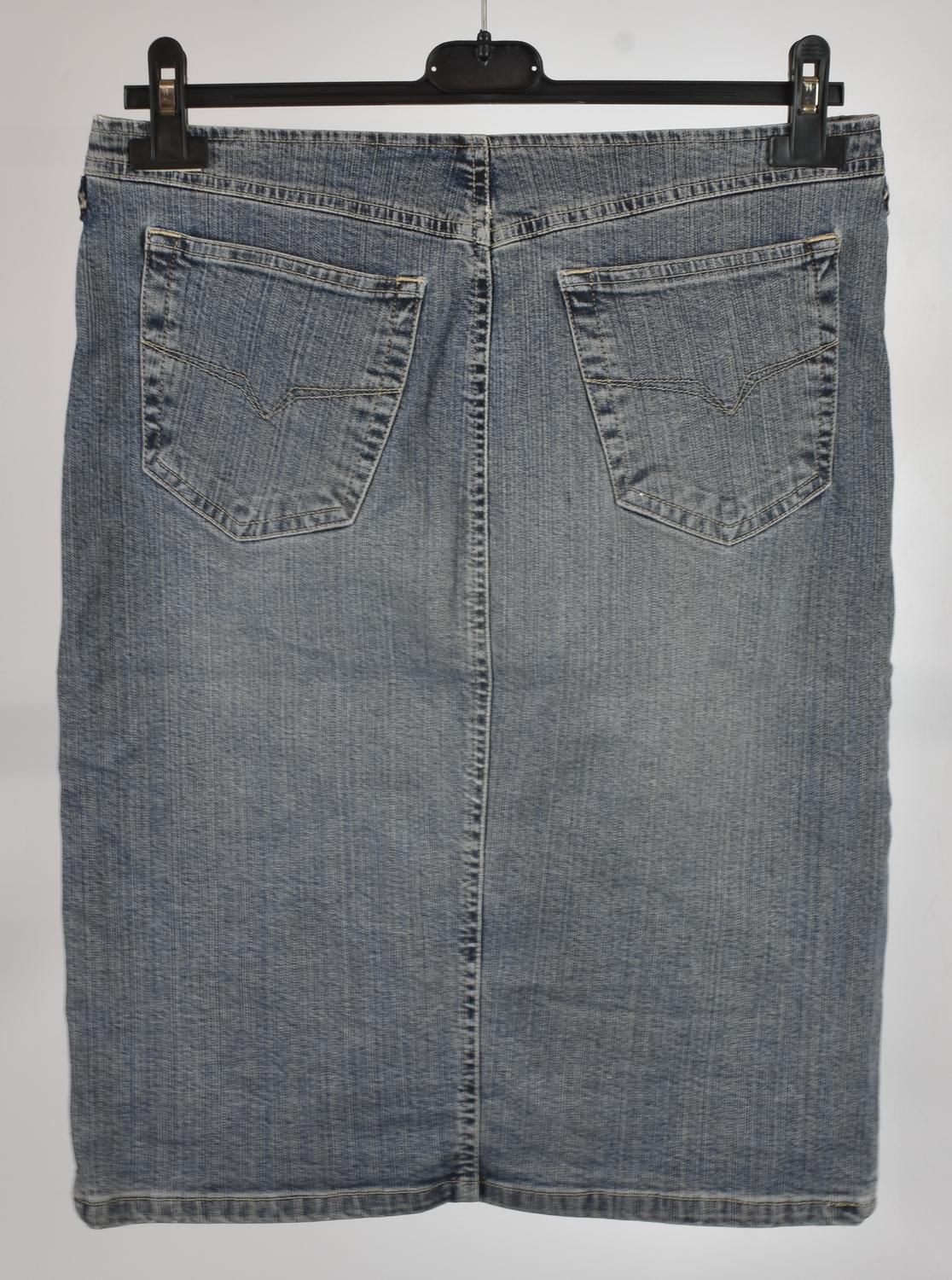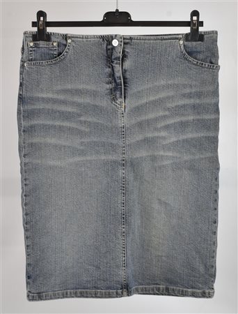 Gonna in denim a cinque tasche. Rivetti a testa di Medusa. Taglia 46 IT. Prodotta in Italia. Segni d’uso e del tempo. Ben conservata.