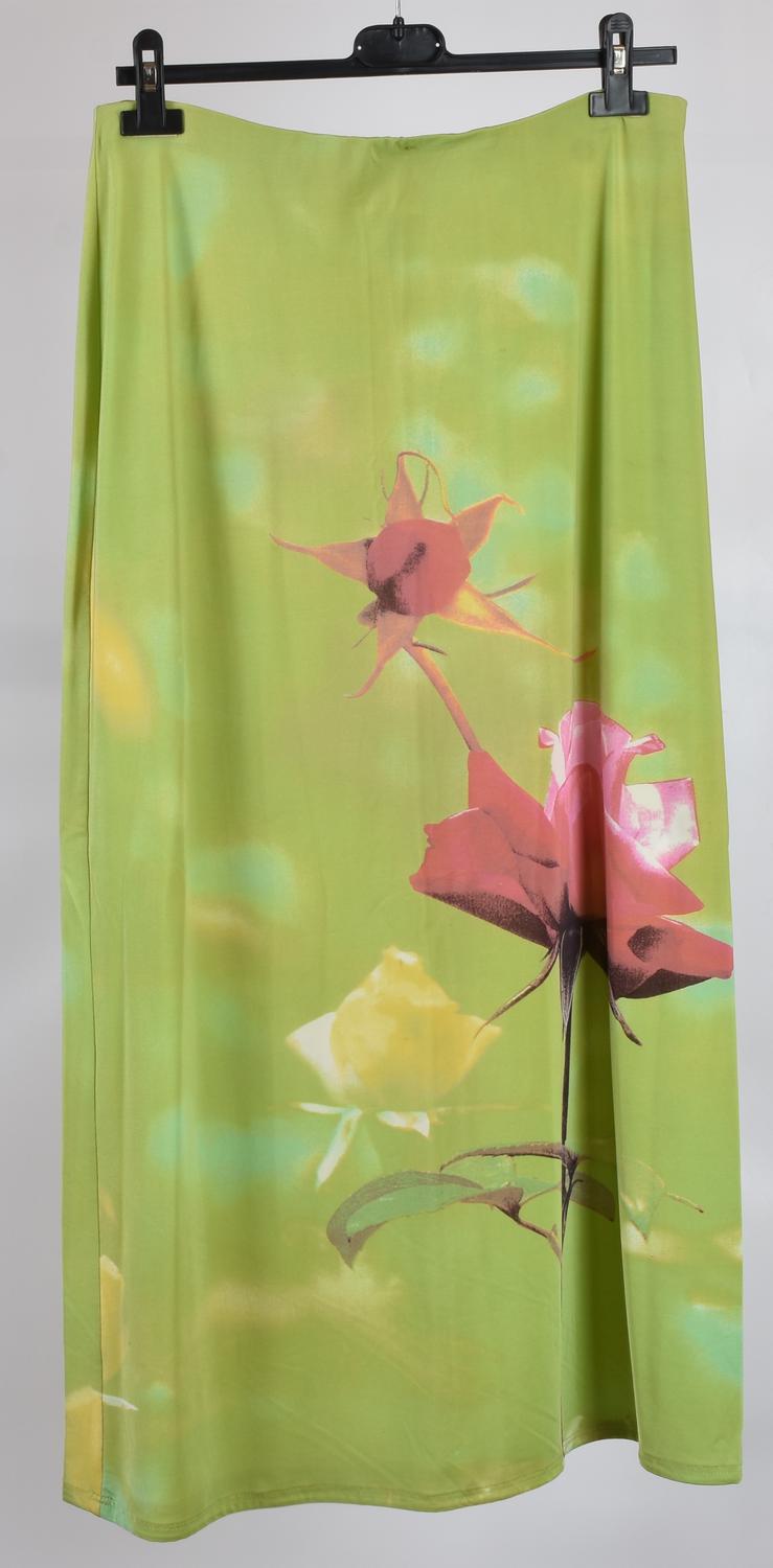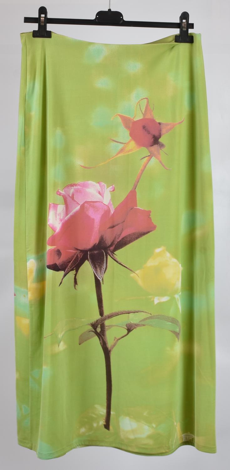 Gonna lunga in tessuto elasticizzato con elastico in vita. Taglia L. Prodotto in Italia. Lievi segni d’uso non compromettono le ottime condizioni generali. Ben conservato.