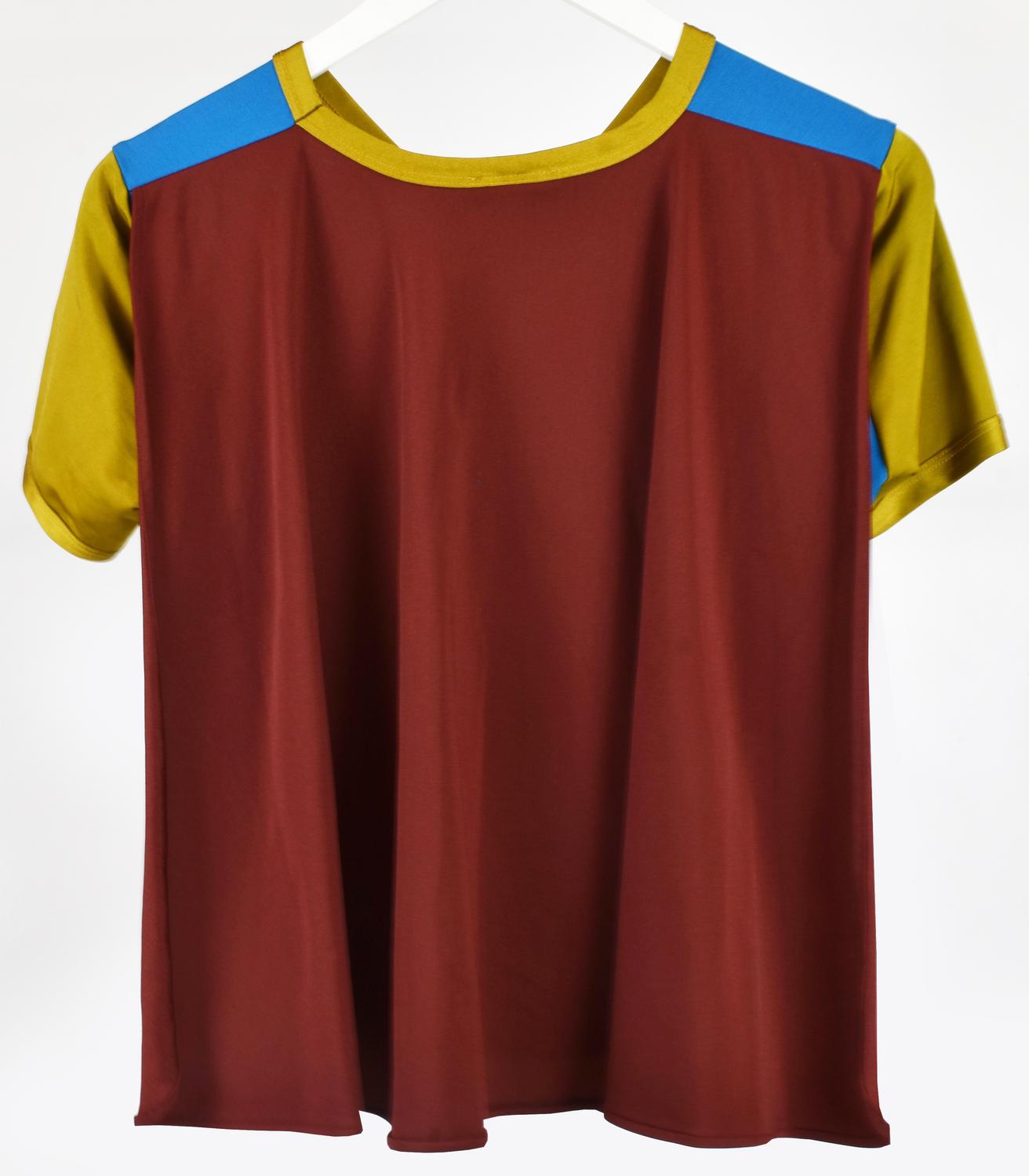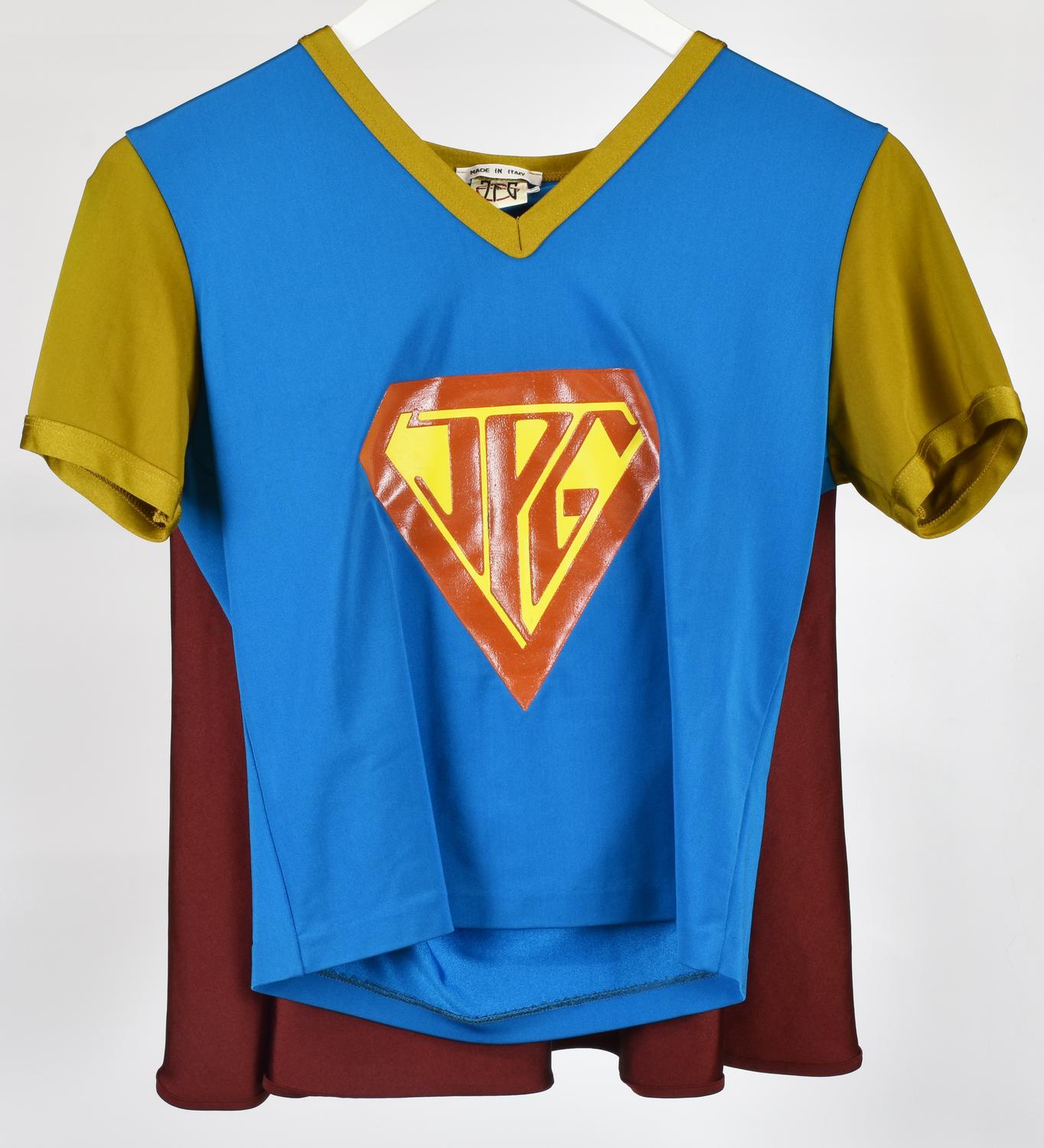 Iconica t-shirt SUPERHERO con logo frontale e mantello. Tessuto sintetico elasticizzato. Taglia S. Prodotto in Italia. Perfettamente conservato.