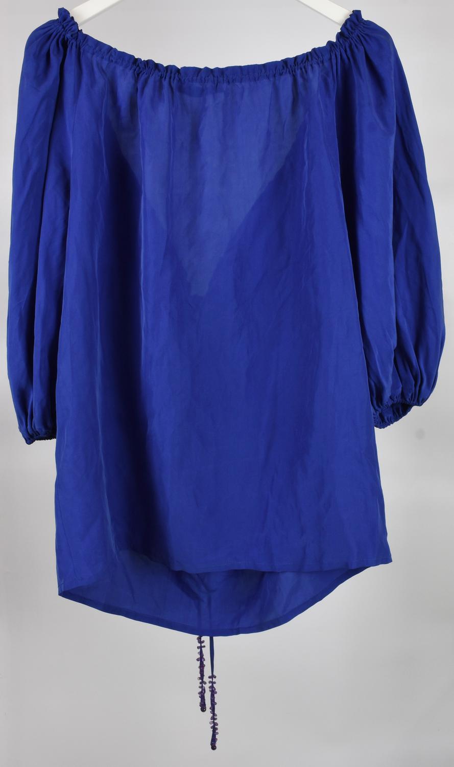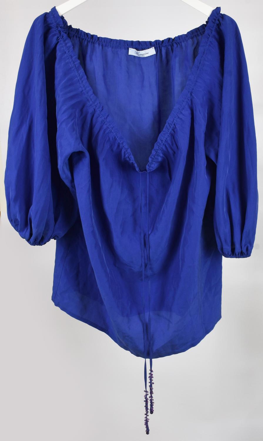 Ampia blusa in seta con coulisse il cui laccio è decorato con piccole ametiste applicate. Maniche leggermente a sbuffo. Taglia 42IT. Prodotta in Italia. Perfettamente conservata.