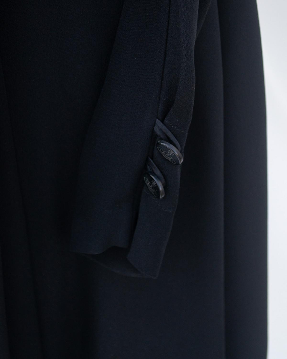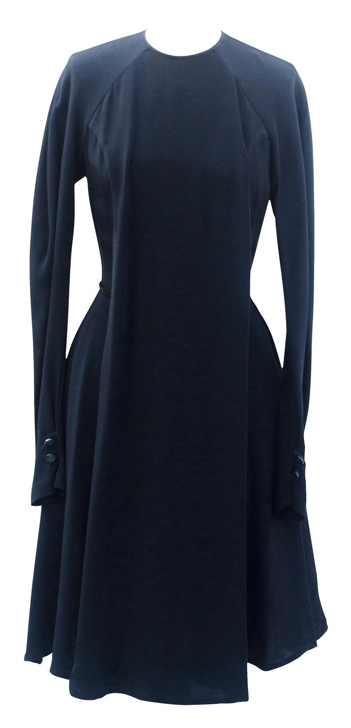 flared Dress in silk crepe cady black, cocktail dress with a deep slit on the back trimmed collar with satin ribbon. Also a satin ribbon is used to adjust the waist line. Special Made in Gold Label in the 90s. Made in England, UK size 10. Perfectly preserved.