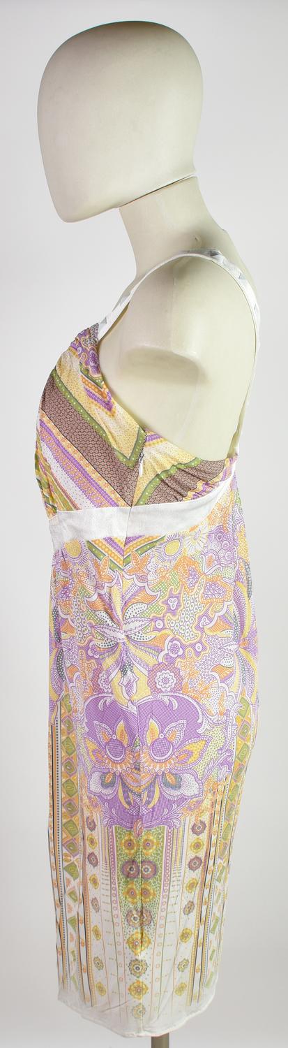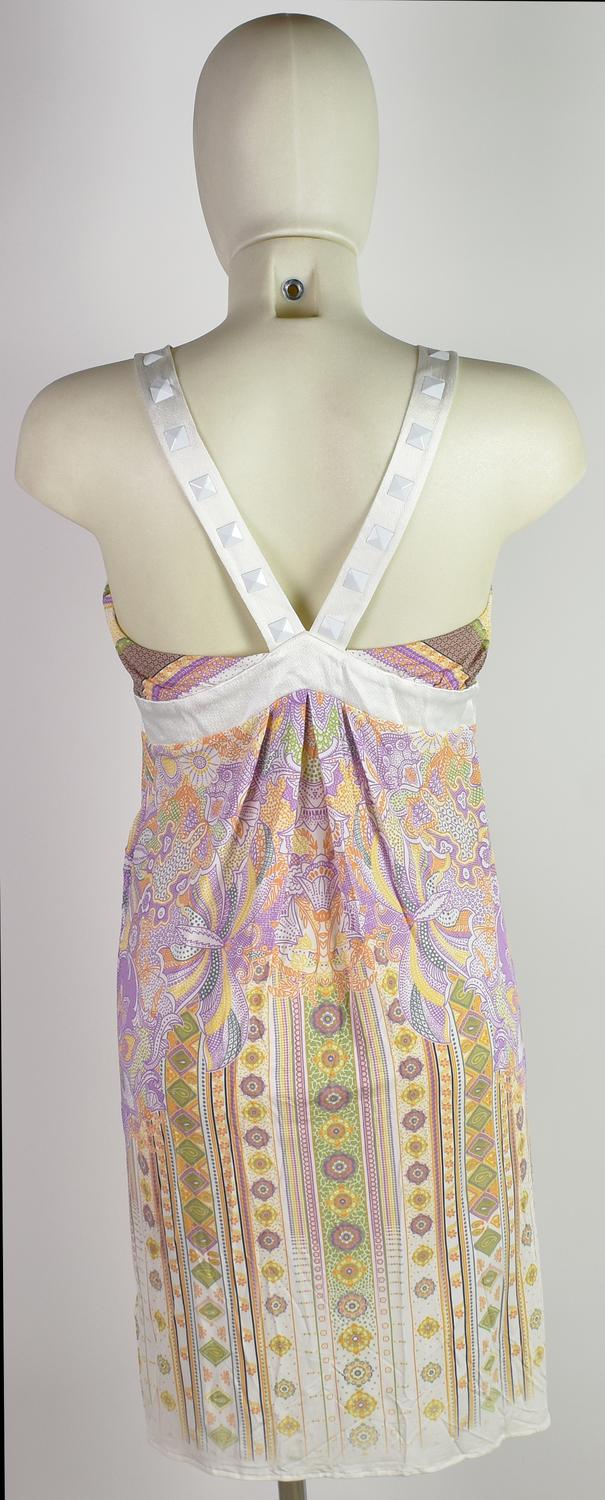 Abito stampato con borchie applicate sulle spalline e cerniera laterale. Taglia 46 IT. Prodotto in Romania. Perfettamente conservato.