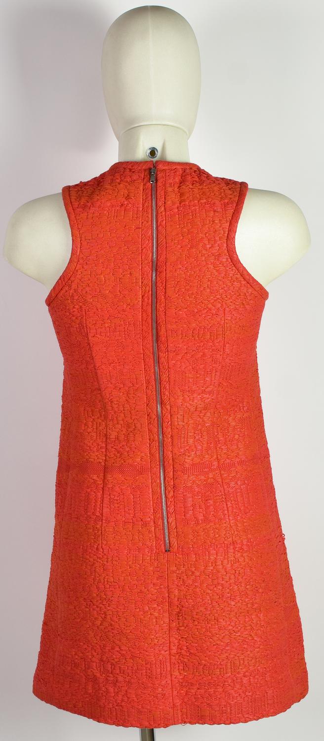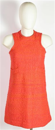 Abito rosso con scollo all’americana. Presenta una coppia di taschini decorativi e una di tasche a filetto. Chiusura con cerniera. Taglia 36. Prodotto in Ungheria. Ben conservato.