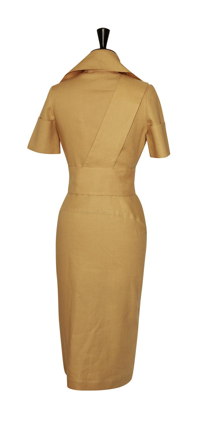 short sleeved safari style dress in desert sand colored linen. Patch pockets on the chest, belt and band that crosses the chest on the front to close it. Made in England in the mid 90s. UK Size 10. Excellent condition