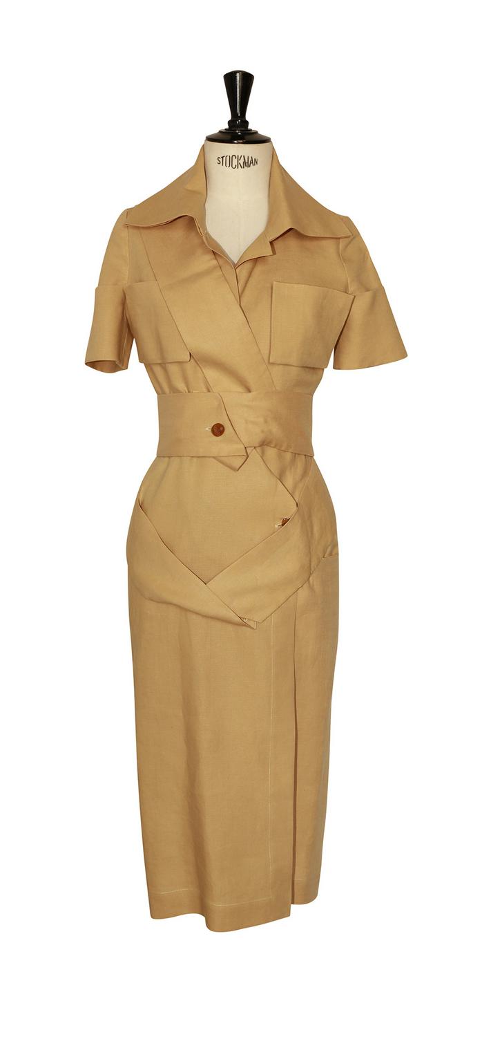 abito stile safari a maniche corte con ampi risvolti in lino colore sabbia del deserto. Tasche applicate sul petto, cintura e banda che incrocia il petto sul davanti per chiuderlo. Made in England in the mid 90s. UK Size 10. Eccellente stato.