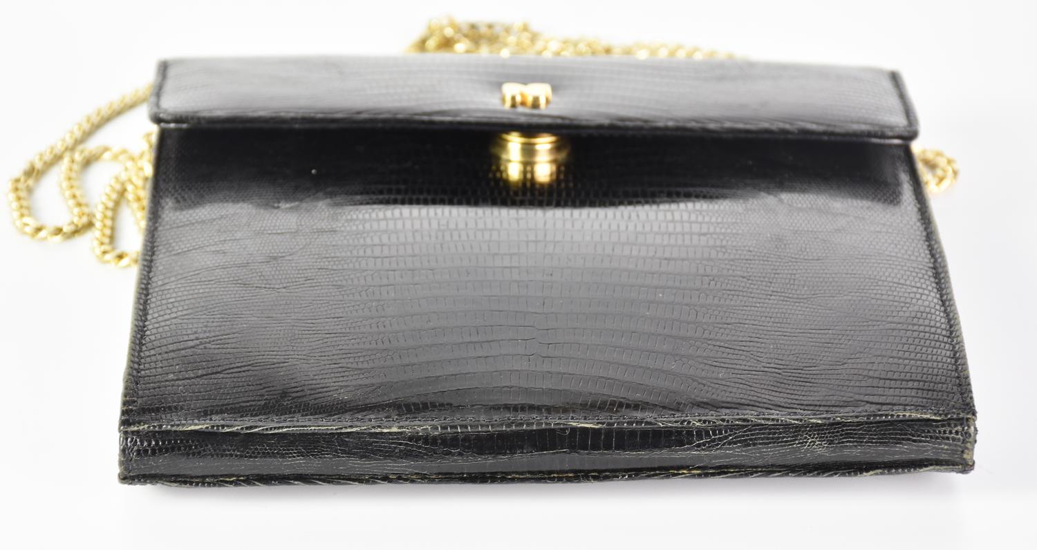 Piccola borsa a tracolla in pelle di lucertola. Interni in crosta con un taschino laterale con chiusura a cerniera. Chiusura magnetica e hardware in metallo dorato. Cm 18x17x2. Ben conservata.