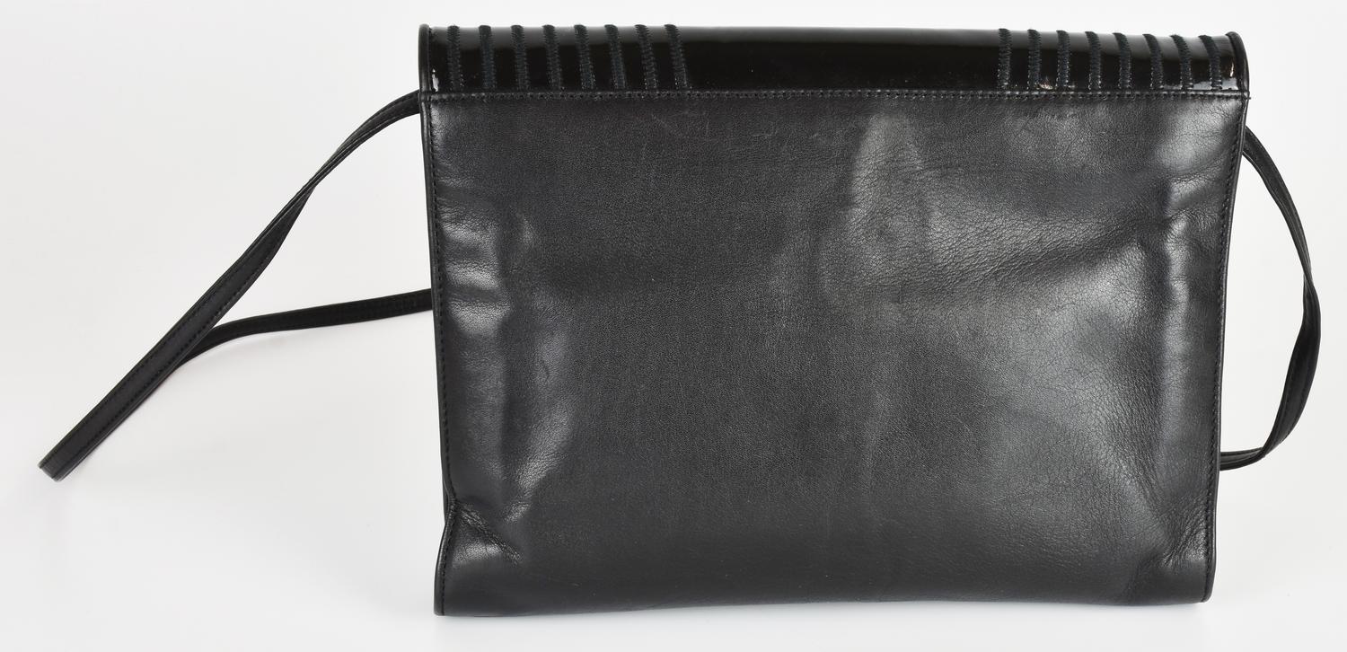 Borsa a tracolla in pelle nera. Tracolla rimovibile. Chiusura con patta frontale in vernice. Interno organizzato in tre vani, uno chiuso con cerniera e un taschino laterale con cerniera. Logo impresso sulla patta. Cm 25,50x20,00x3,00. Prodotto in Italia. Presenta normali segni del tempo ma ottime condizioni generali. Ben conservata.