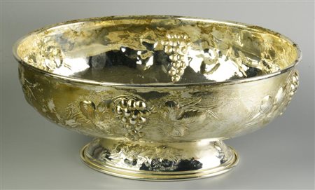 contenitore ovale su piede, vasca a pareti dritte, fondo bombato, piede rastremato verso il basso; sul piede e sulla vasca motivi vegetali resi nel dettaglio; lavorato a sbalzo e cesello; realizzato in argento 800/1000