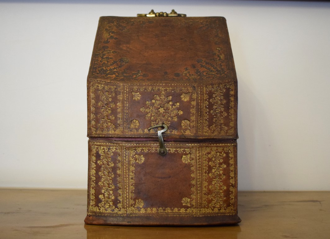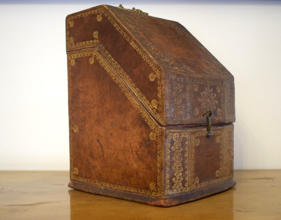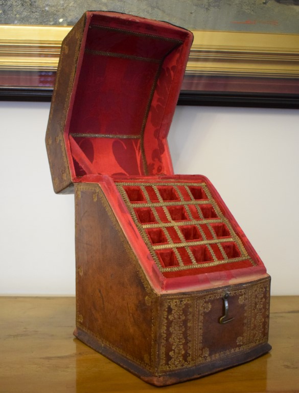 Scatola porta posate in cuoio naturale lumeggiato in oro XVIII secolo cm...