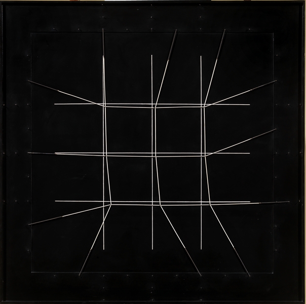 Gianni Colombo (Milano 1937 - Melzo 1993) SPAZIO ELASTICO. SEI DOPPIE LINEE BIANCHE INTERMUTABILE molle, elastici, chiodi, spago e smalto su tavola, cm 100x100 sul retro: firmato, titolato e datato; dedica dell’artista ai coniugi Stoppino eseguito nel 1977 L’opera in corso di archiviazione presso l’Archivio Gianni Colombo Provenienza Acquisito direttamente dall’artista dall’attuale proprietario