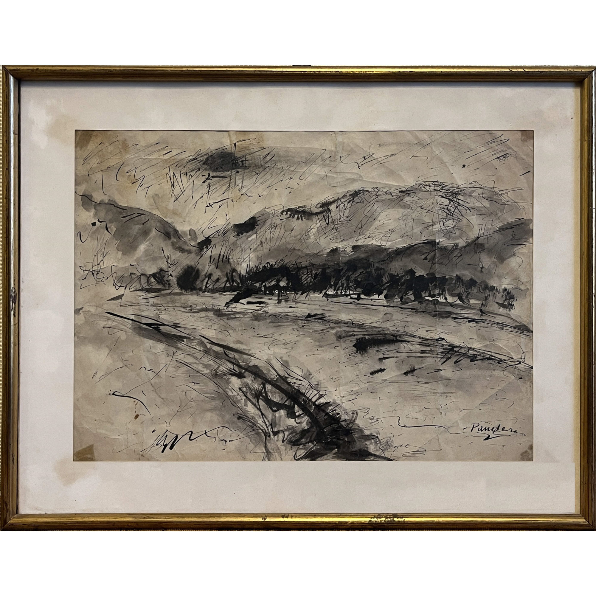 Gino Pancheri, Paesaggio, inchiostro, china e acquarello su carta cm 24x34. In cornice cm 33x43. Firmato in basso a dx