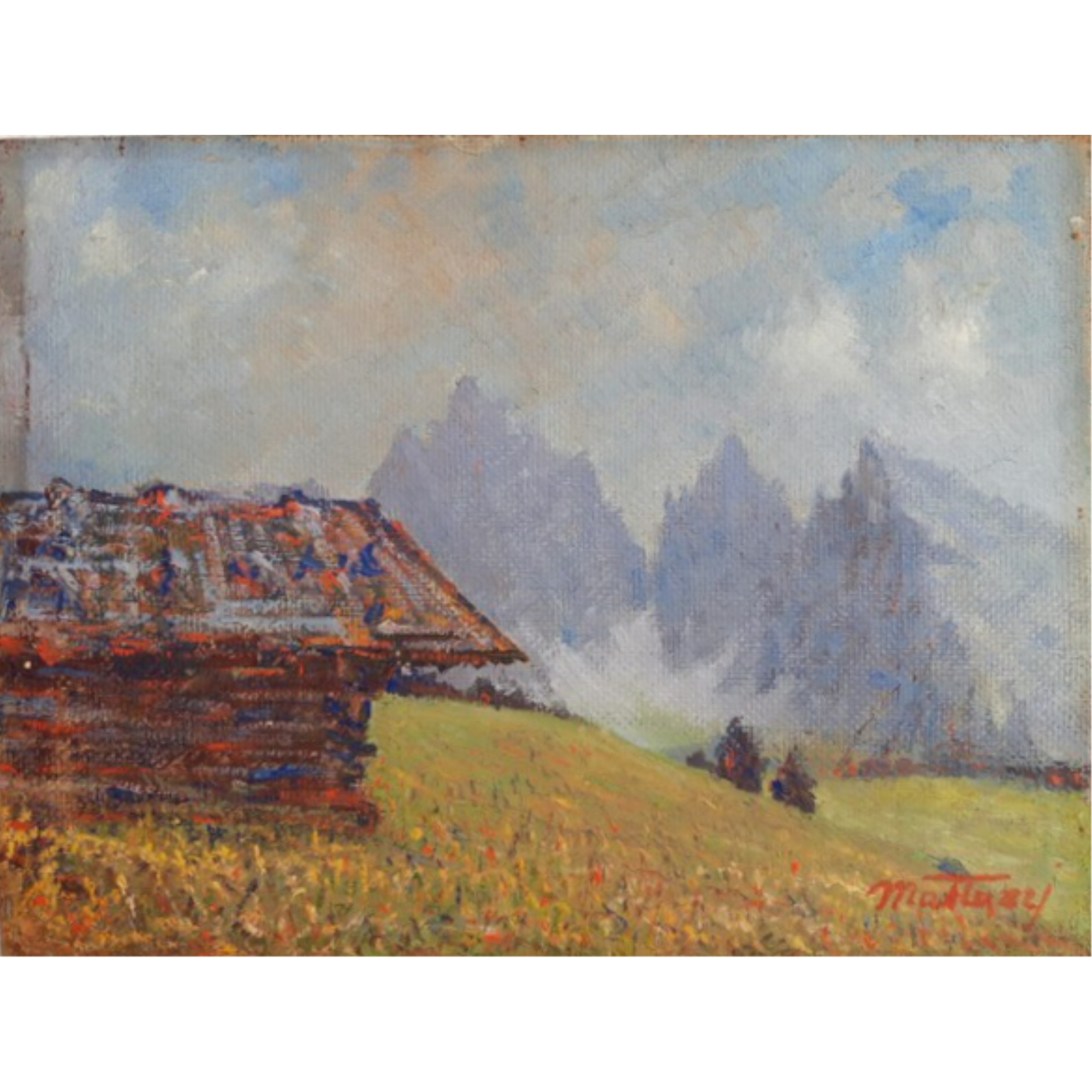 Guido Mattuzzi, Baita con panorama (prob. Alpe di Siusi), olio su tela. In cornice.