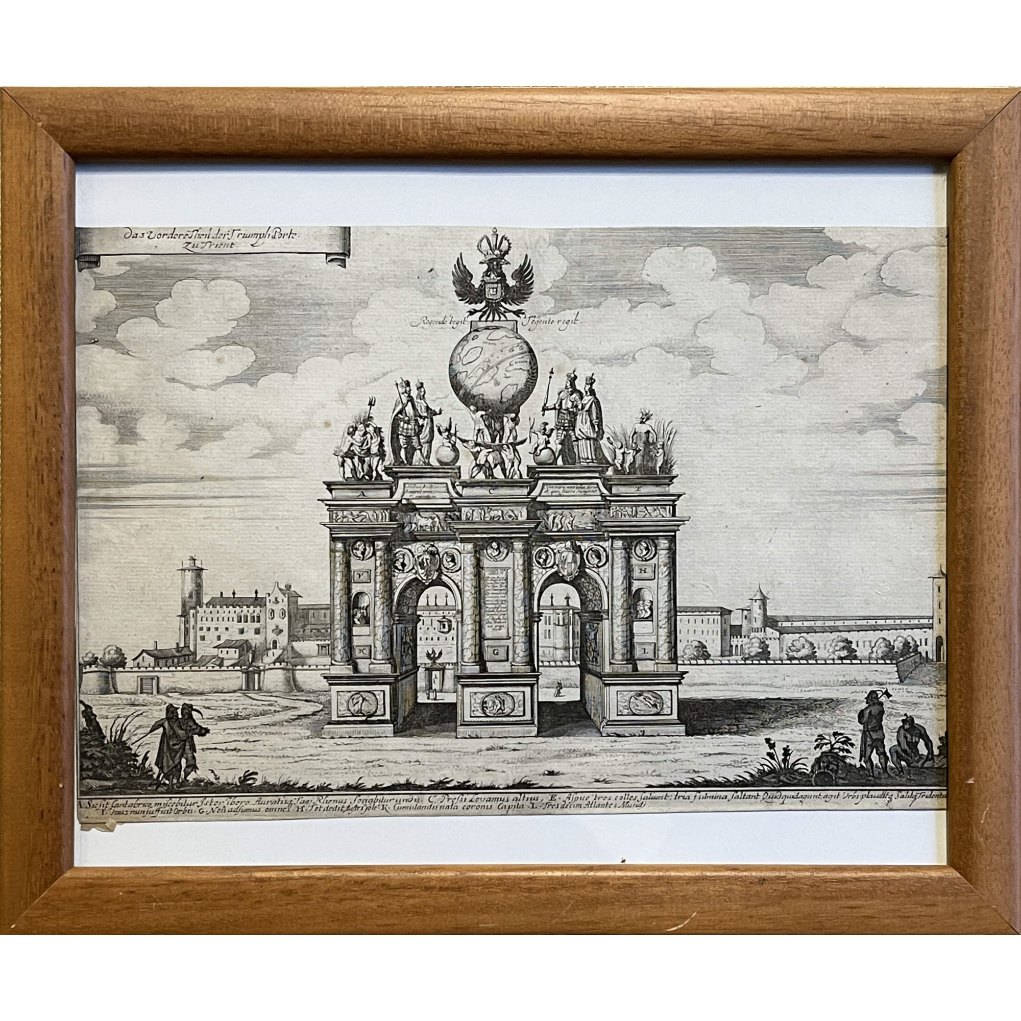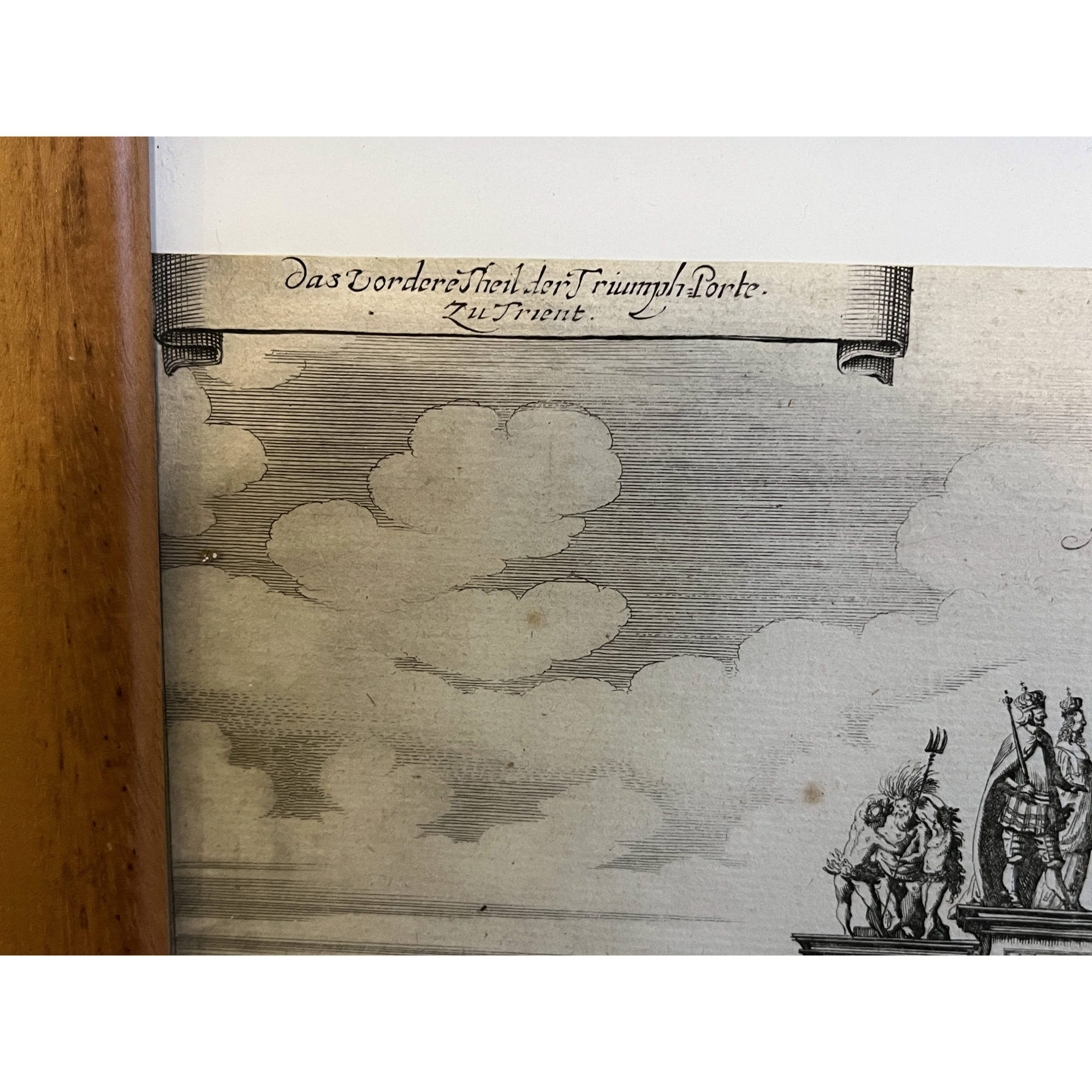 Matthäus Merian (1652), La parte anteriore della Porta del Trionfo a Trento (in alto a sx iscrizione "Das vorderetheil der triumph porte zu Trient"), incisione, cm 19,5x29. In cornice. Prospetto anteriore dell'arco trionfale eretto in contrada S. Marco in occasione della visita a Trento dell'imperatore Ferdinando IV nel 1648. Sullo sfondo si intravede il castello del Buonconsiglio.