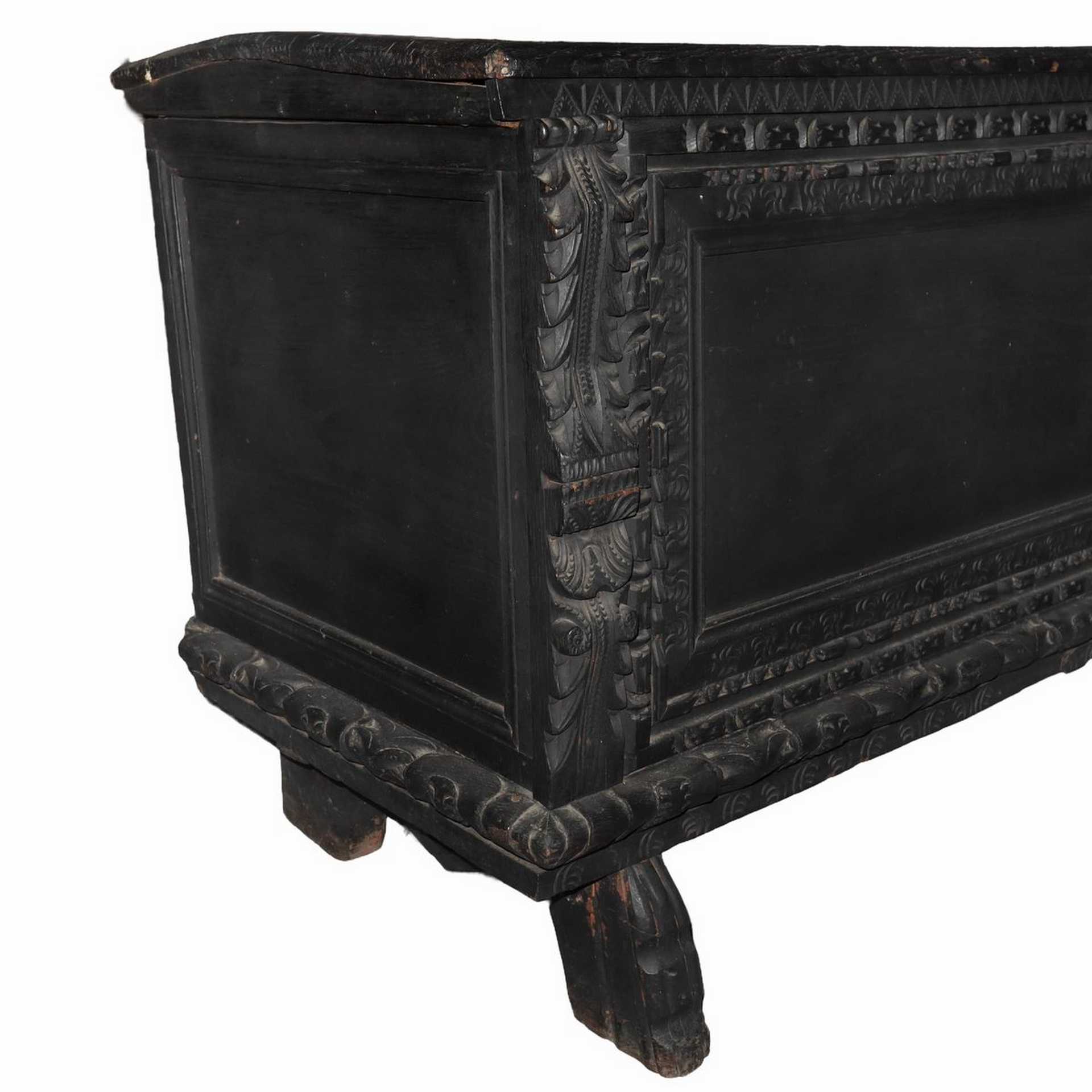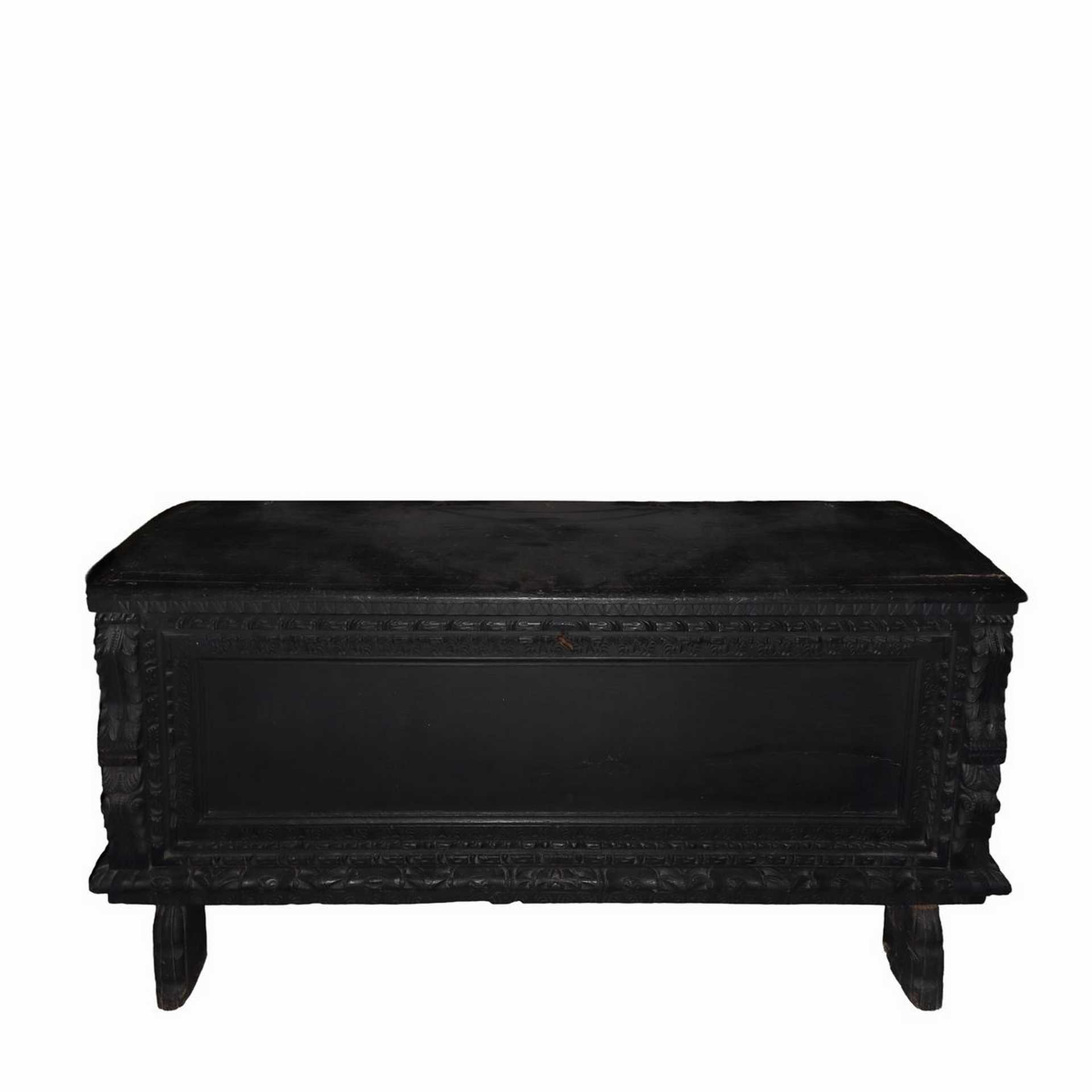 Cassapanca Sarda, 17° secolo 182 x 85 x 65 cm In legno di noce. Grande cornice alla base scolpita ed intagliataIn legno di noce. Grande cornice alla base scolpita ed intagliata