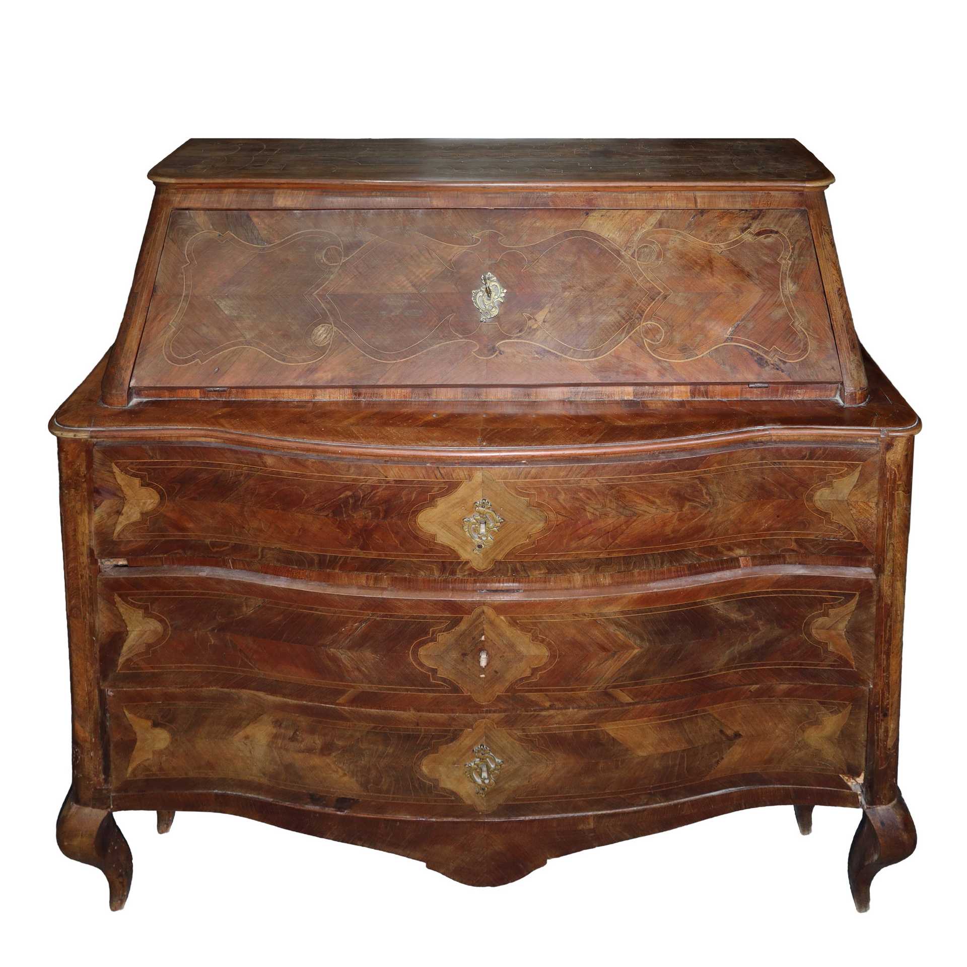Cassettone a tre cassetti e alzata con ribalta, Spain, 18° secolo Intarsi sul fronte in legni chiari. Segni del tempo.Intarsi sul fronte in legni chiari. Segni del tempo.