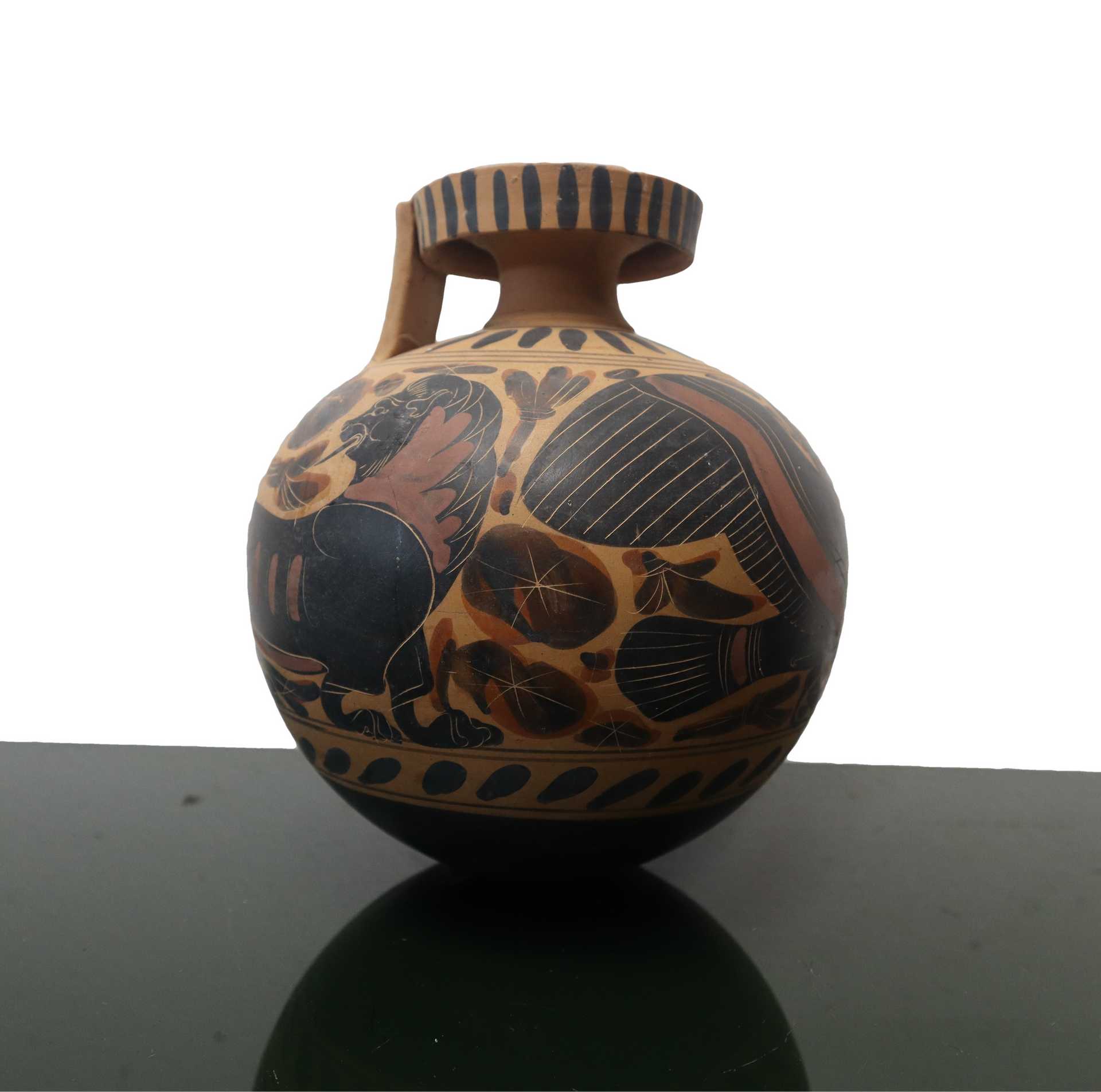 Riproduzione archeologica, Vaso globulare con manico collo stretto ed ampio collo piatto. Anza sull'orlo e sulla spalla. Raffigurazioni mitilogiche. Commerciabili giusto parere Soprintendenza per i beni culturali ed ambientali di Catania del 13/12/22 N° protocollo 19871