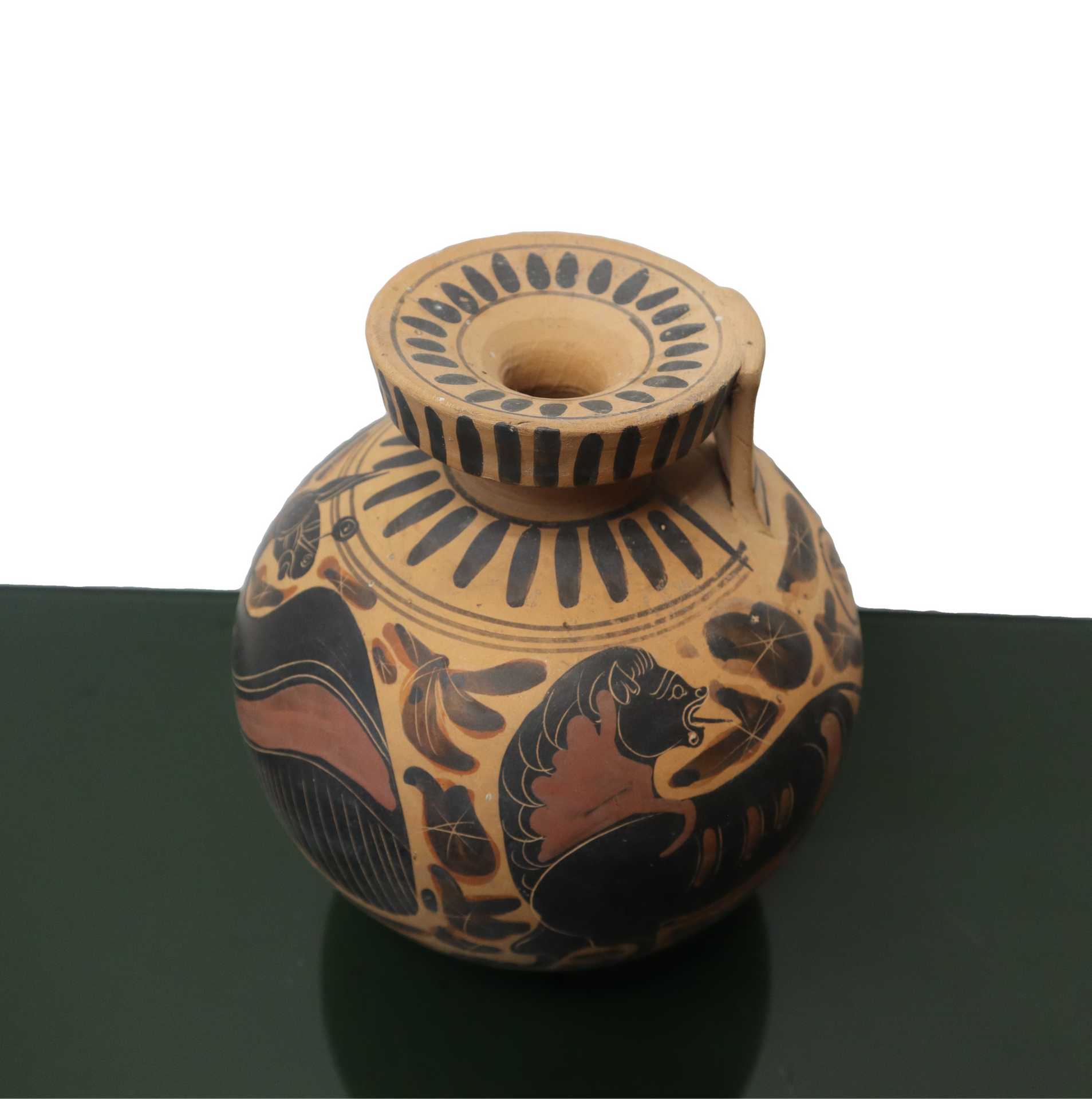 Riproduzione Ariballo. Commerciabile giusto parere Soprintendenza per i beni culturali ed ambientali di Catania del 13/12/22 N° protocollo 19871 cm 21, diametro bocca cm 9,5 terracotta dipinta