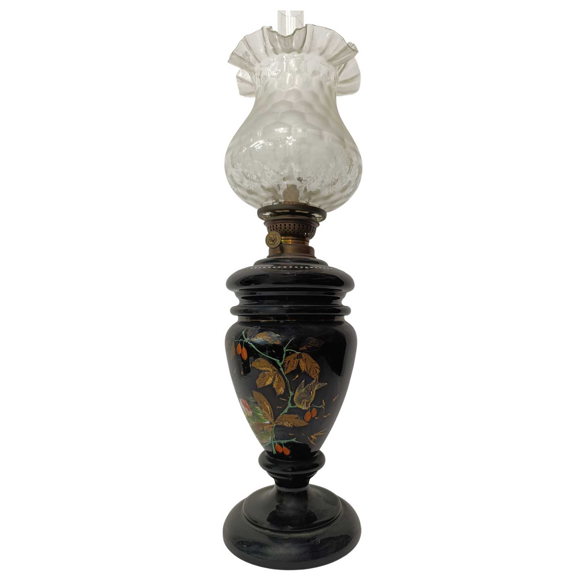 Lume a petrolio in opaline nero dipinto con scena campestre e diffusore in vetro