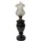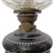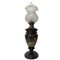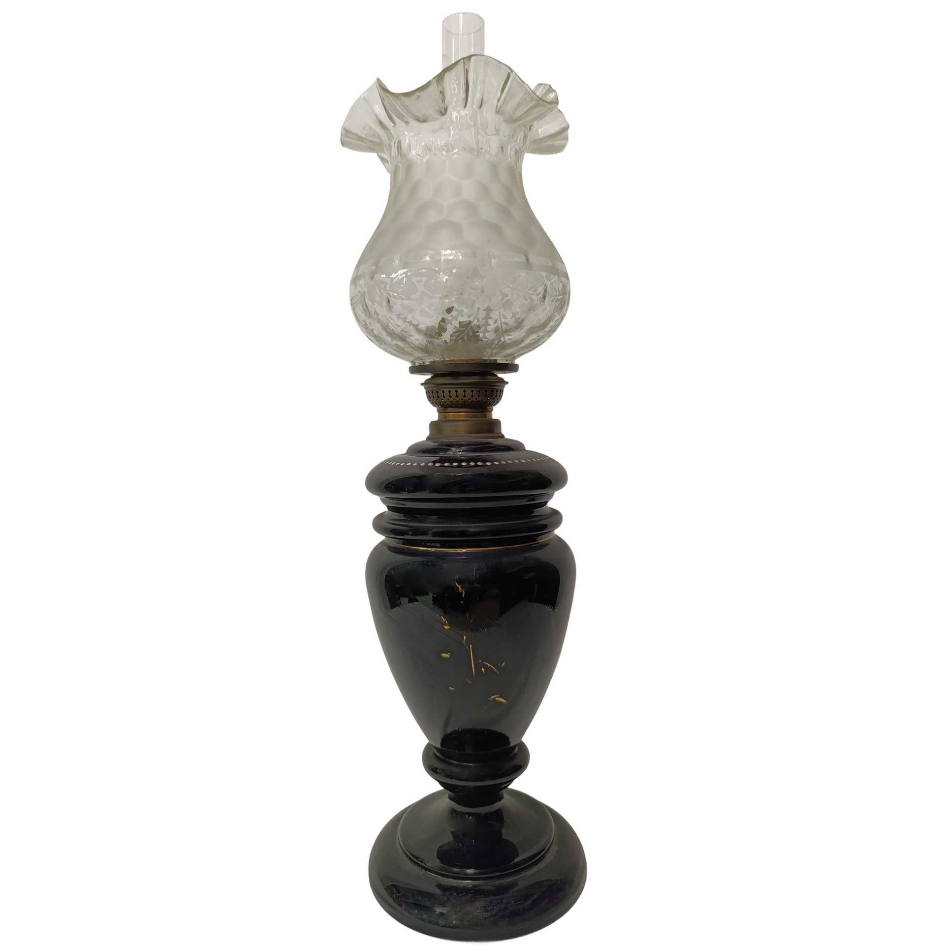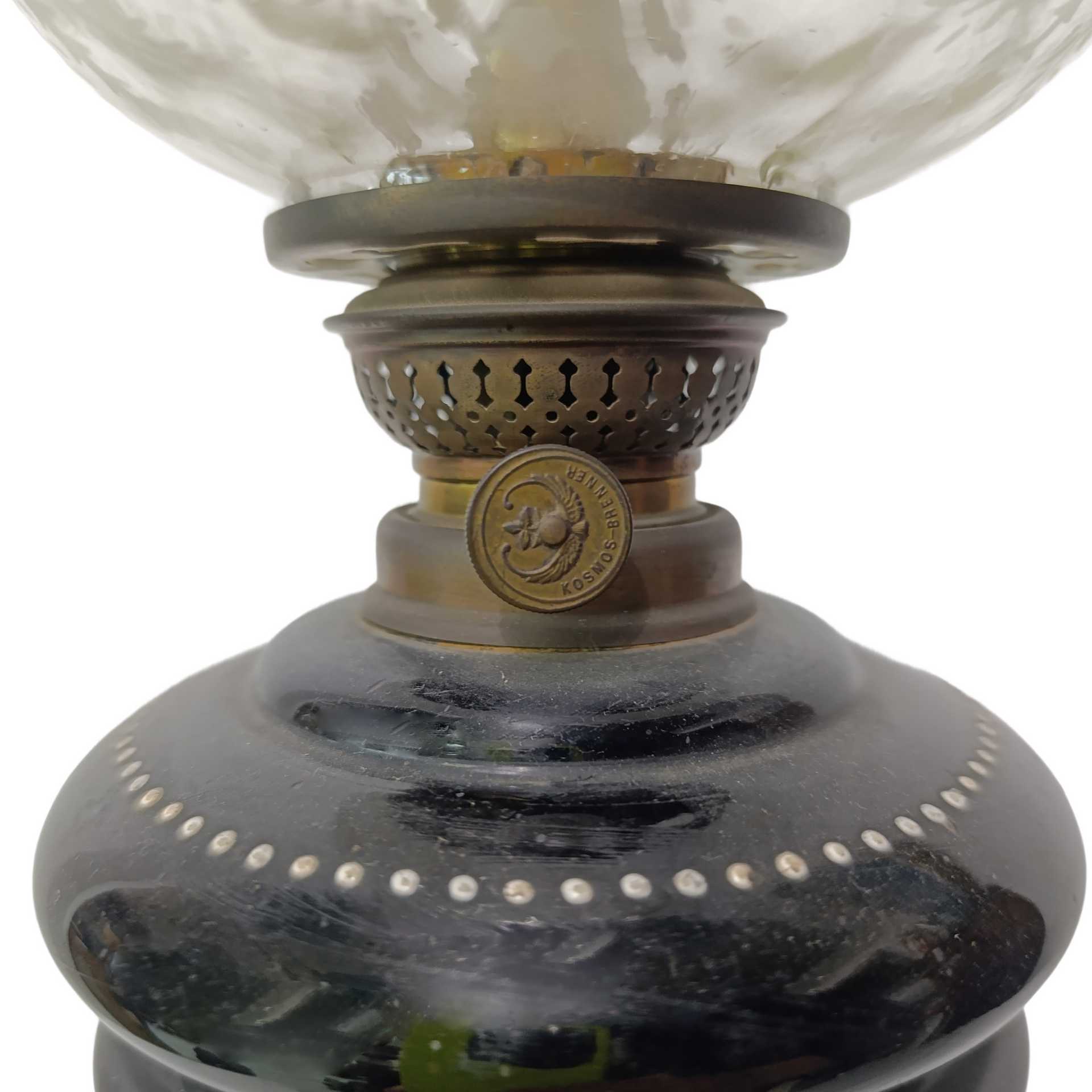 Lume a petrolio in opaline nero dipinto con scena campestre e diffusore in vetro h cm 54