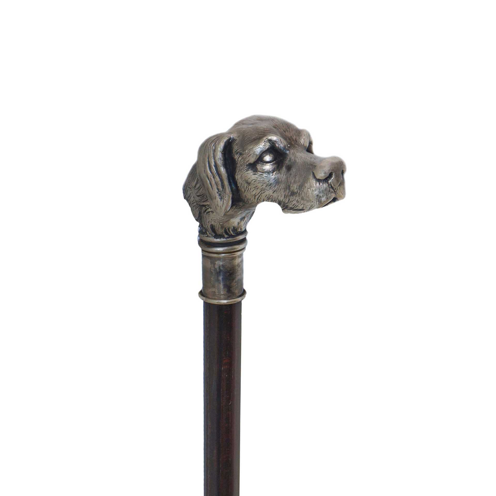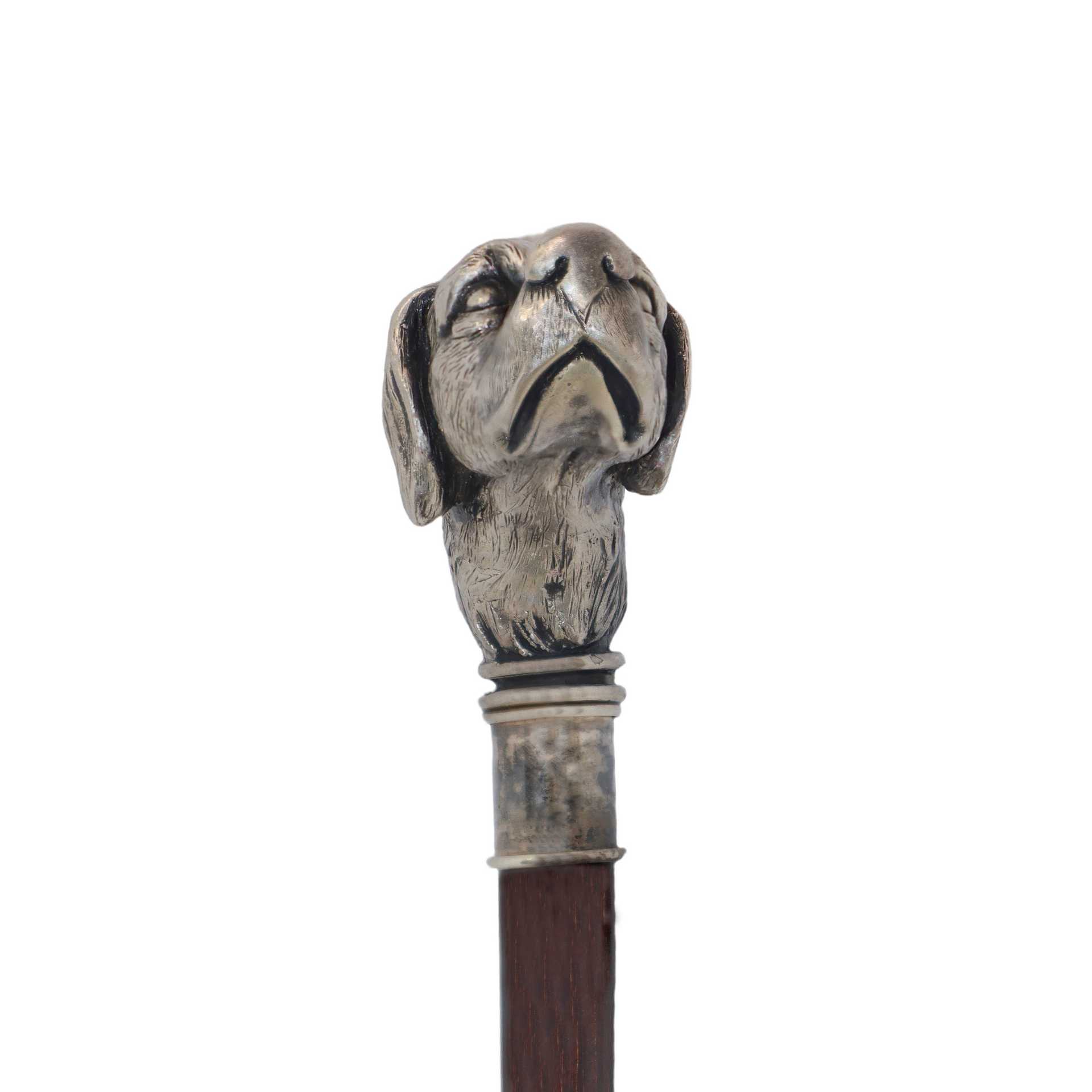 Bastone in legno di malacca con impugnatura a forma di testa di cane in argento, fine 19° secolo