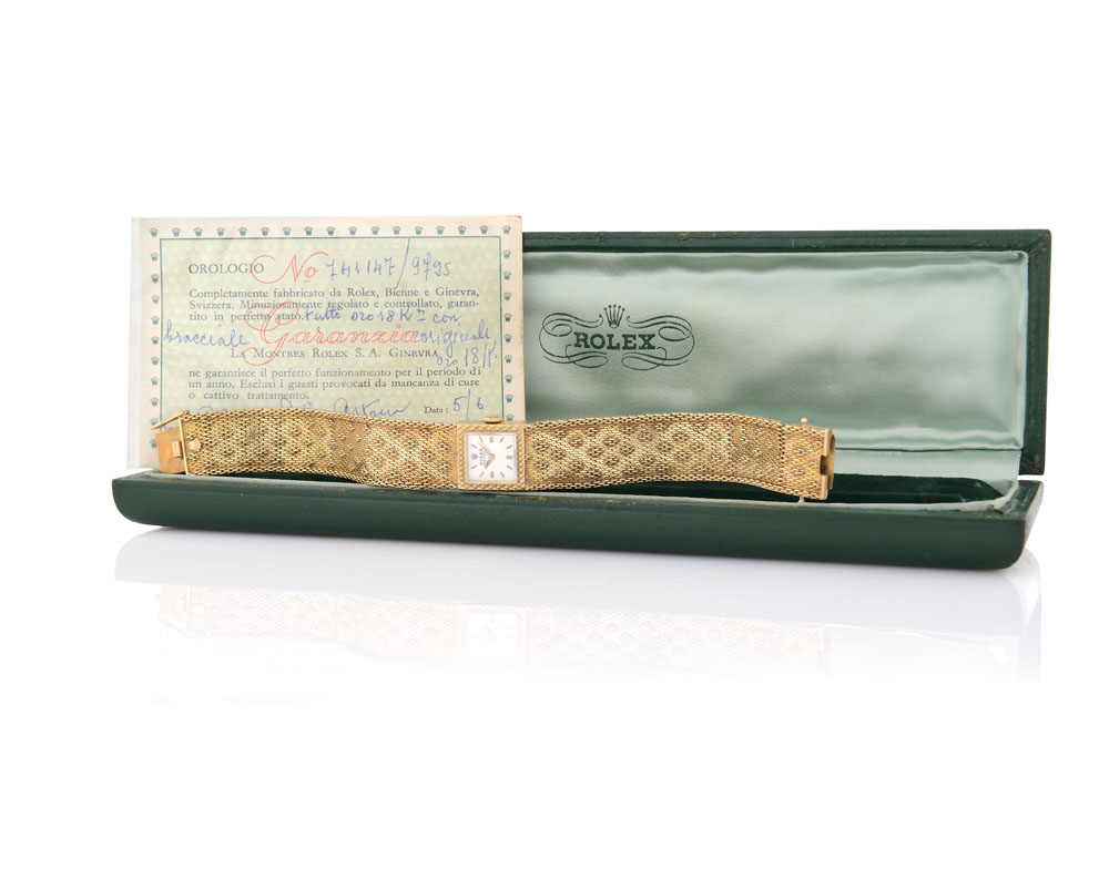 C. square-shaped 18K yellow gold with 18K yellow gold integrated woven bracelet. D. silvered with applied indexes. M. manual winding. Dial, case, movement and bracelet signed. Accompanied by Rolex box and certificate dated 06/1963..