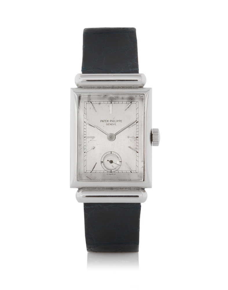 C. rectangular, stainless steel with hooded lugs. D. silvered with applied indexes and subsidiary seconds. M. rectangular, manual winding. Dial, case and movement signed. Accompanied by Patek Philippe strap and Extract from the Archives.