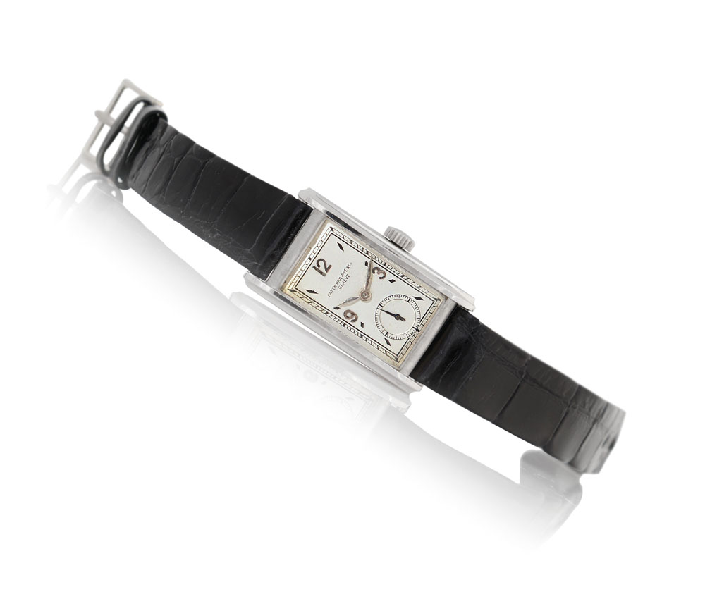 C. rectangular-shaped, platinum. D. silvered with applied indexes and Arabic numerals. M. manual winding. Dial, case and movement signed. Accompanied by Patek Philippe strap and 18K white gold buckle, Extract from the Archives.