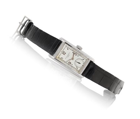 Cassa n. 503885 rettangolare in platino. Quadrante argentato con indici e numeri arabi applicati, secondi al 6. Movimento n. 831282 di forma a carica manuale. Quadrante, cassa e movimento firmati. Completo di cinturino e fibbia in oro bianco originale, estratto di registro.