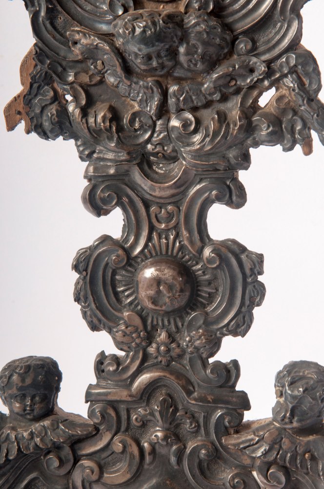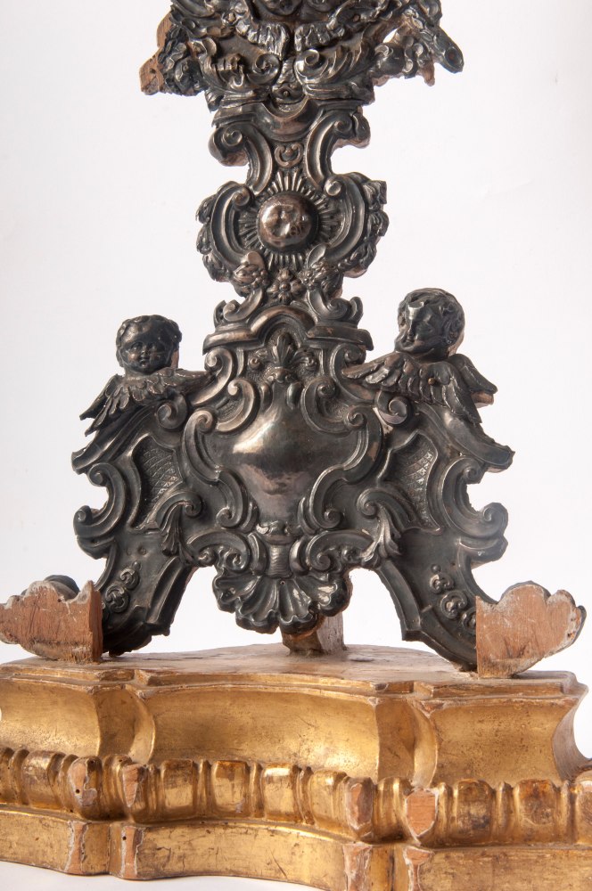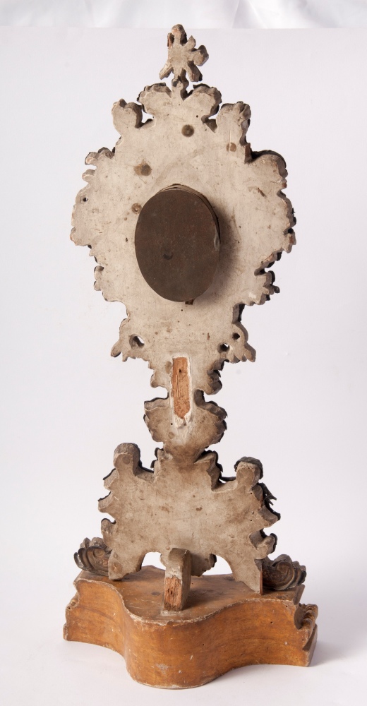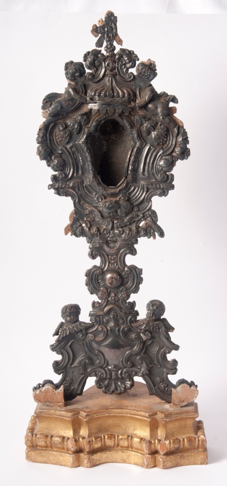 Porta reliquie in argento sbalzato ed inciso su struttura in legno. Basetta in legno dorato, punzonatura della Camera Apostolica con le chiavi e l'ombrello come in uso a Roma dopo la riforma della corporazione degli orafi ed argentieri voluta da Clemente XII negli anni 30" del XVIII secolo.
