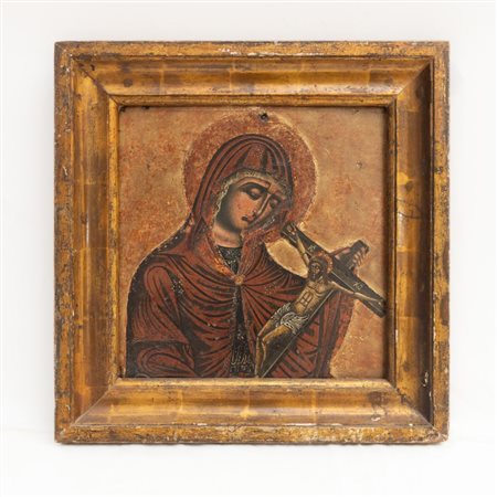 Madonna con Crocifisso scuola bizantina in Toscana, prima metà XIX secolo dipinto su tavola a fondo oro 30 x 29 cm