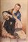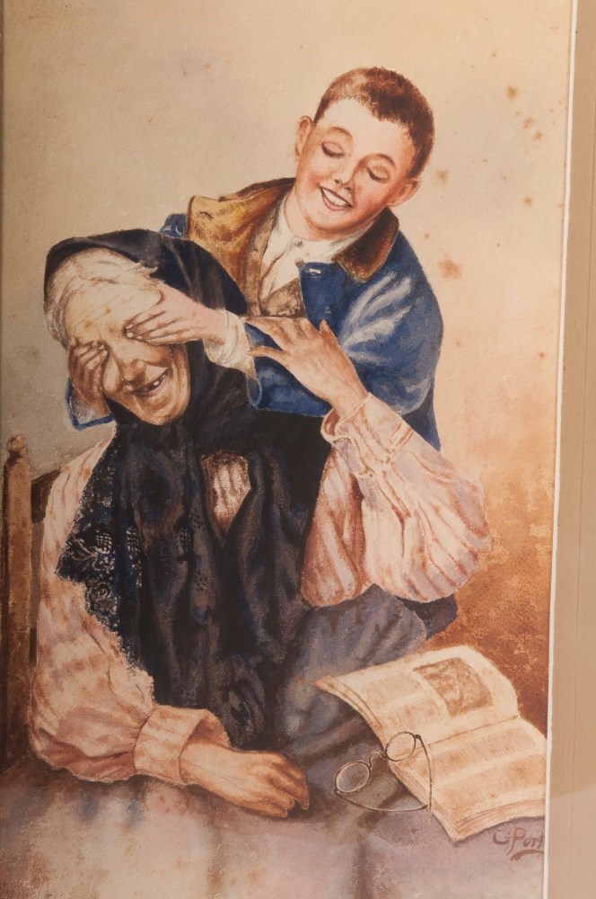raffiguranti fanciulla che fuma la pipa e fanciullo che gioca con anziana in cornice, firmato G. Porta