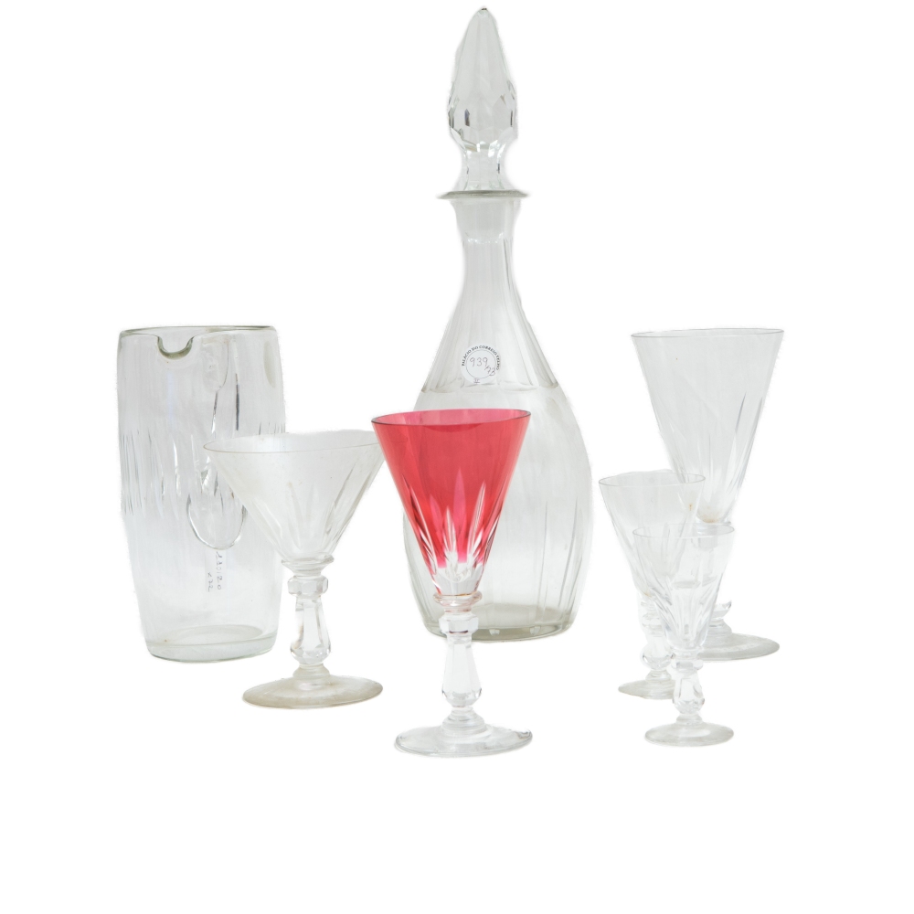 Servizio di bicchieri in cristallo bianco e rosso in sei diverse misure prima metà XX secolo