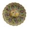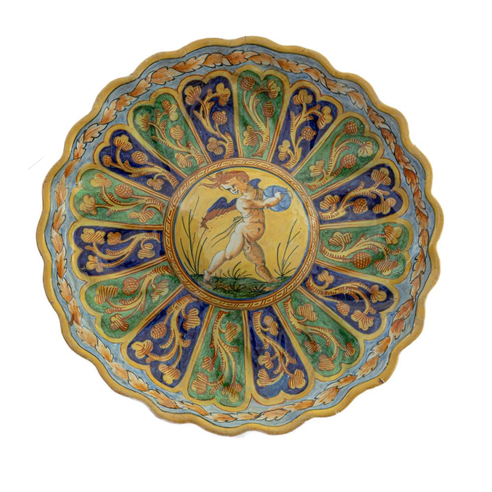 in ceramica policroma, dall'orlo mistilineo da cui scendono le costolature che terminano nel centro del piatto fortemente umbonato. Decoro policromo a fasce verticali con elementi floreali. Umbone con scena di putto danzante su fondo ocra, firmato ala retro in blu sotto smalto, manifattura Penazzi Bagnocavallo