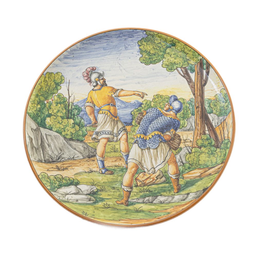 in ceramica policroma, con orlo leggermente rialzato e fondo ad anello ribassato. Decoro con scena di militari in foggia classica entro paesaggio. Manifattura Alfredo Ciulli Colonnata.