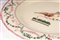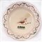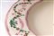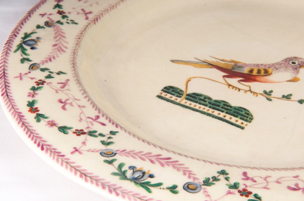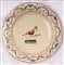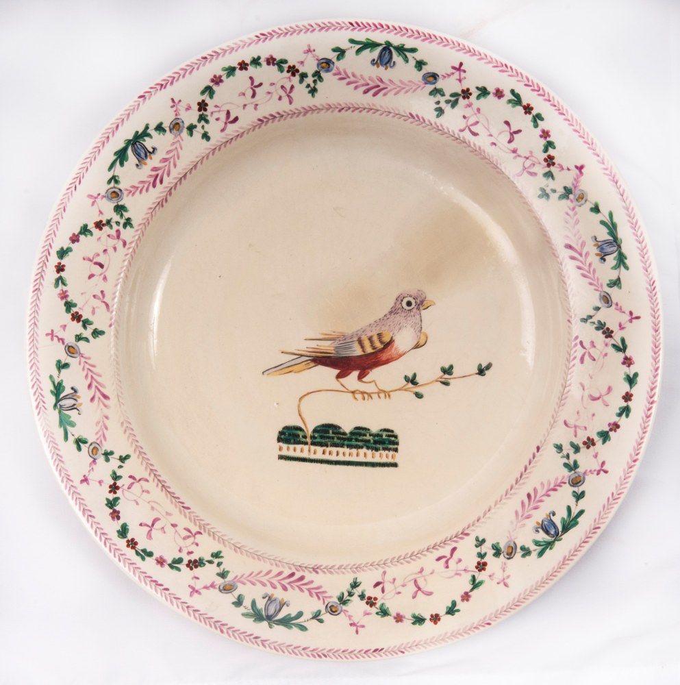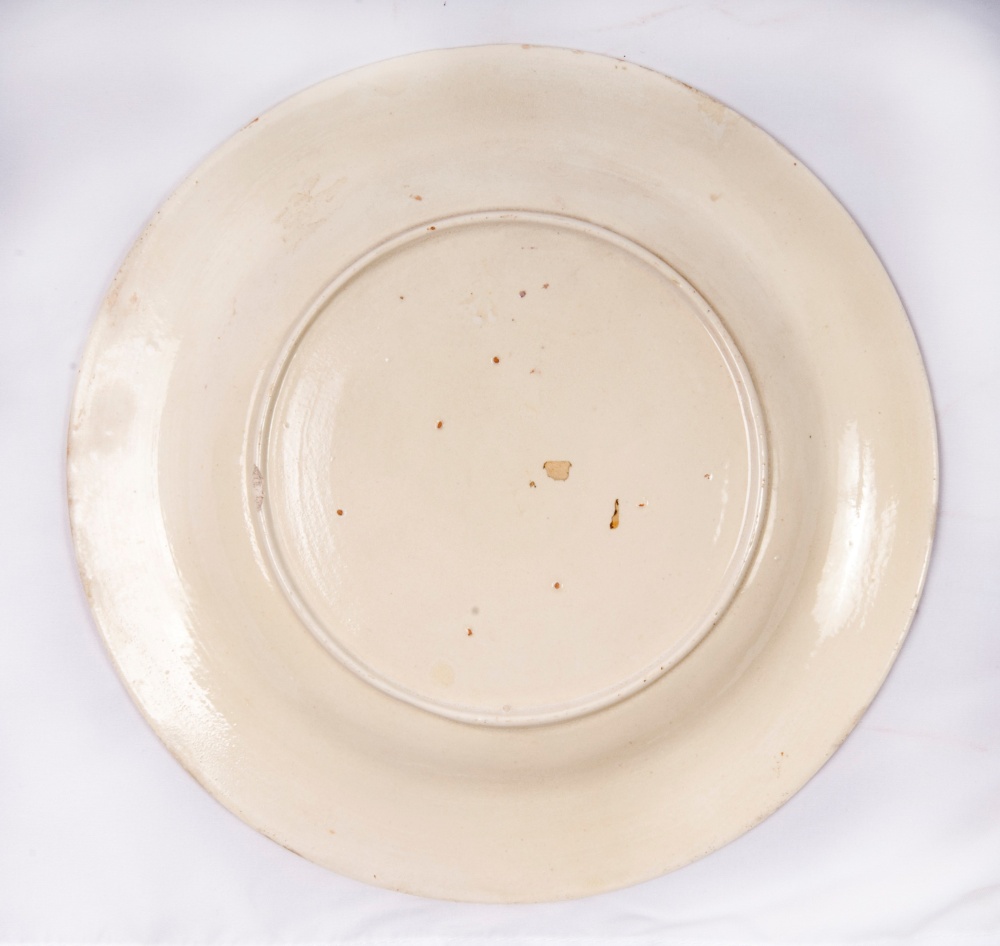 in terraglia a fondo crema con decoro floreale nella tesa ed uccellini nel cavo. Retro ad anello con fondo ribassato. Manifattura Giustiani, Napoli con timbro incusso nella pasta al retro.